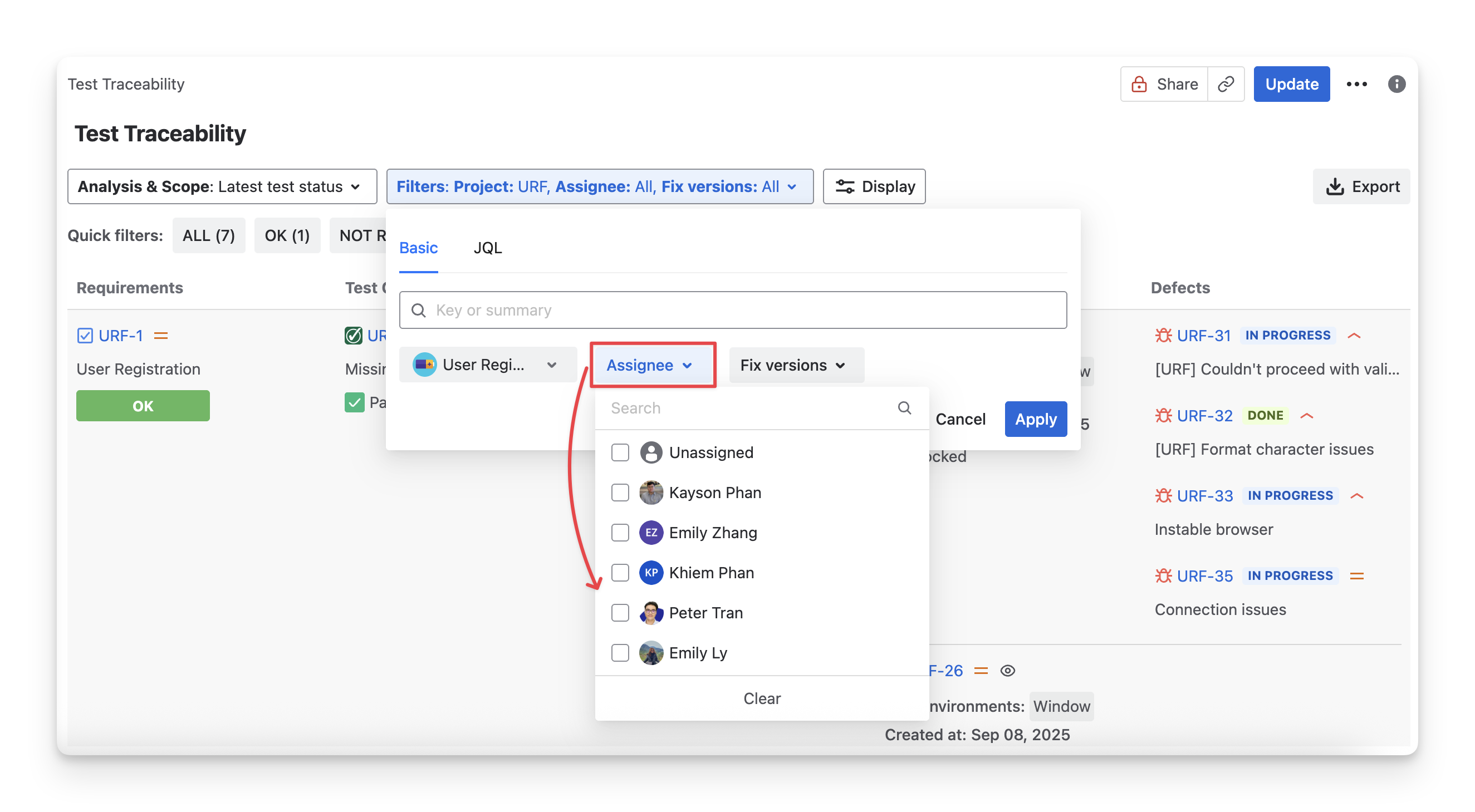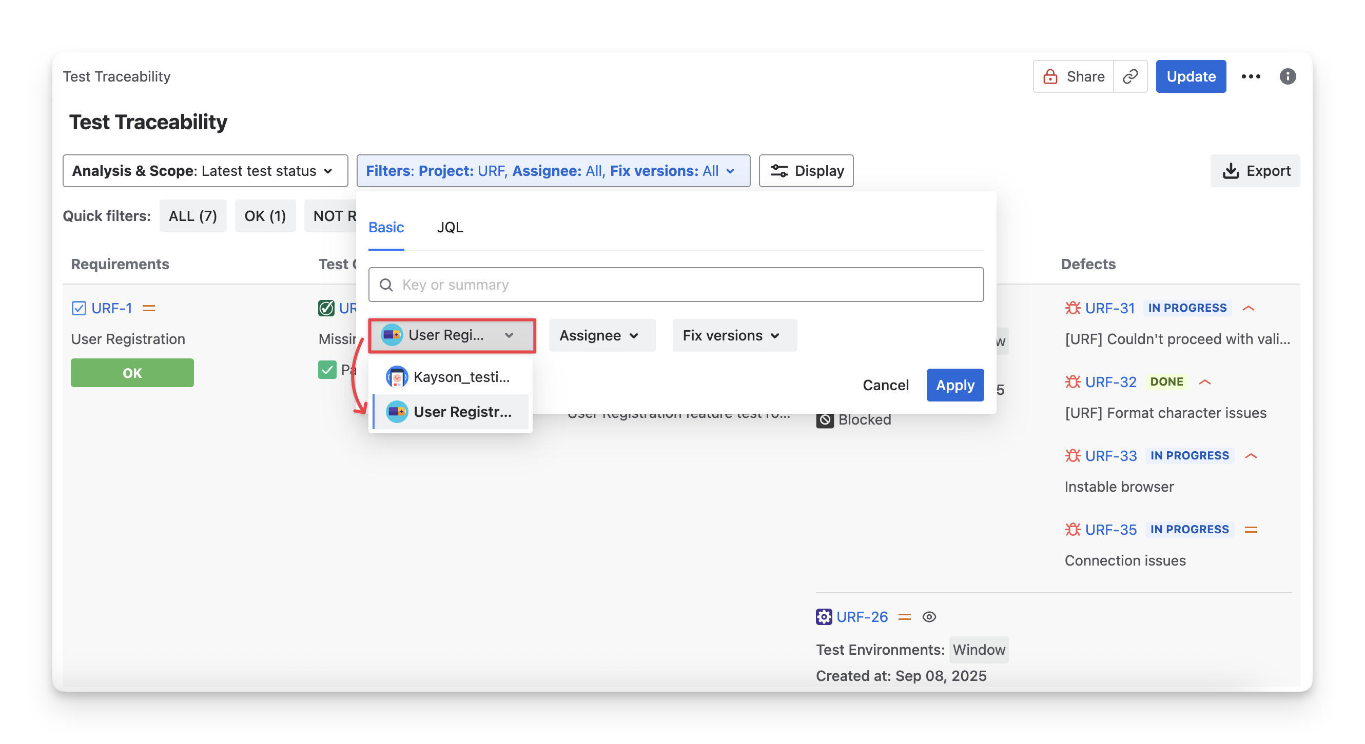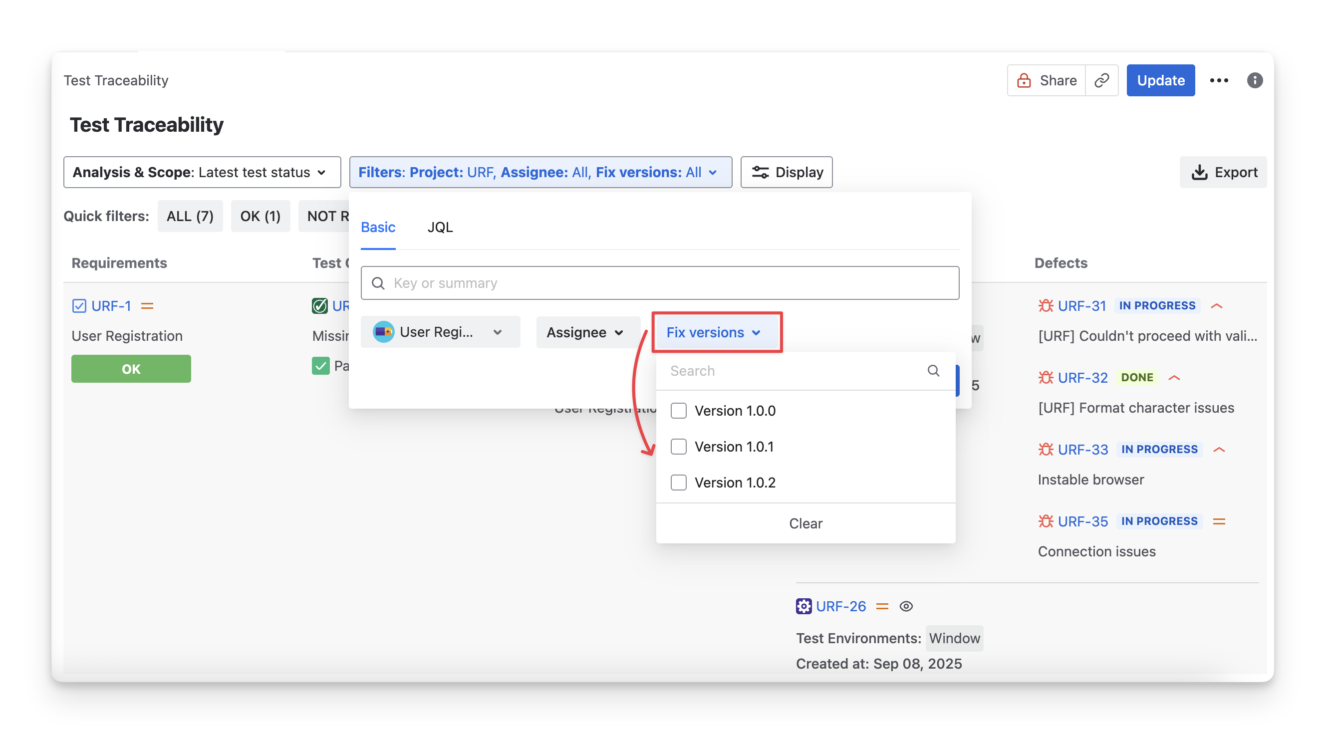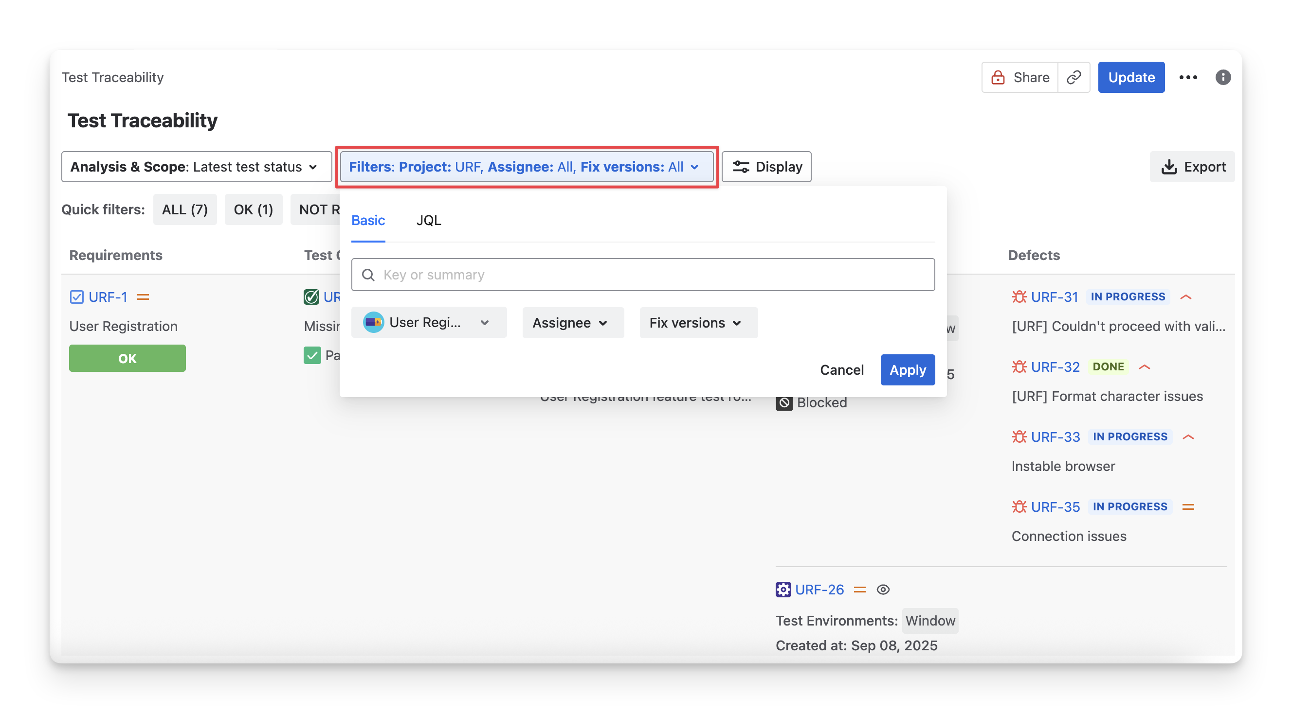 Fix versions: Filter requirements with those associated with specific Jira fix versions.