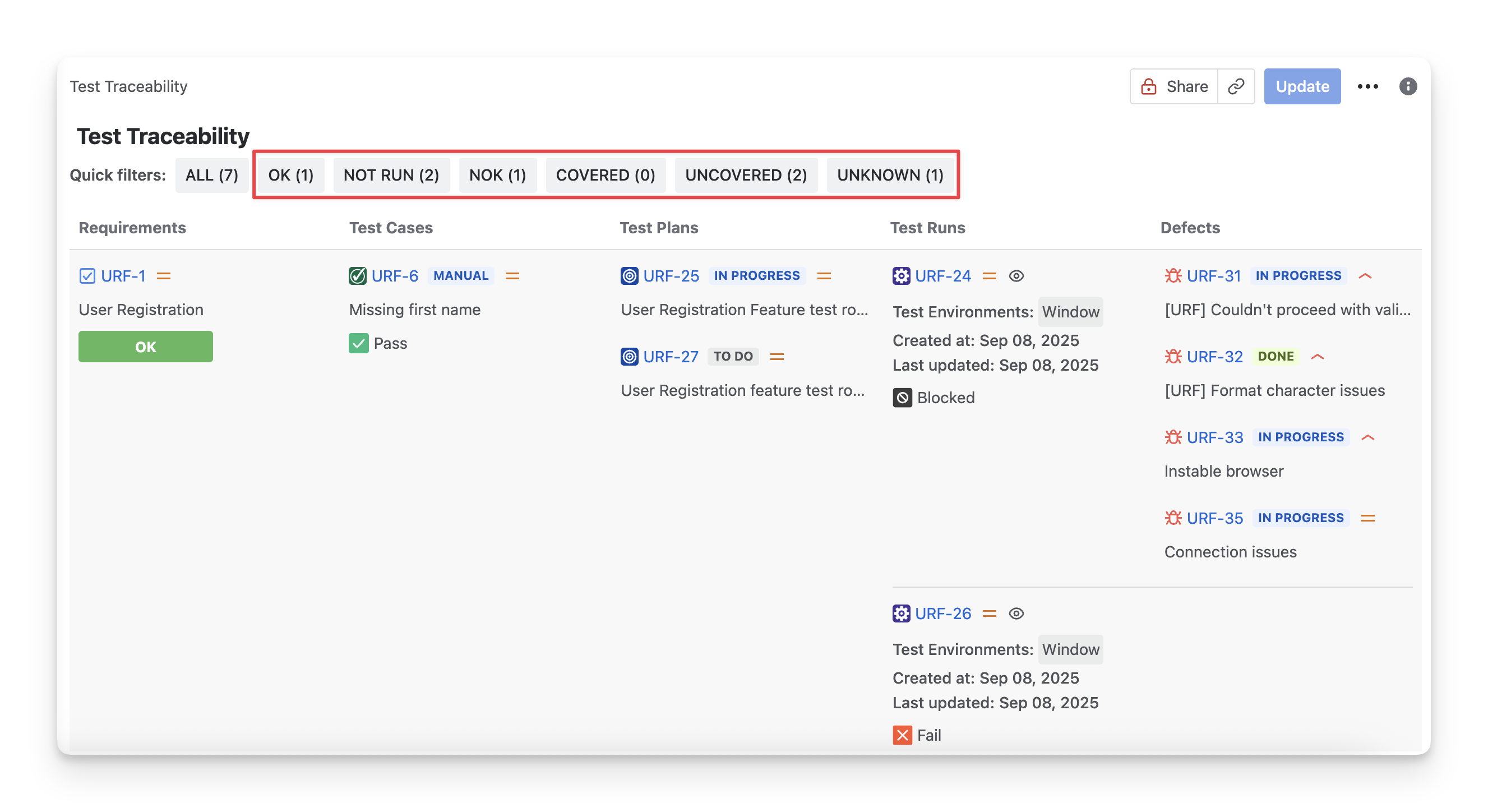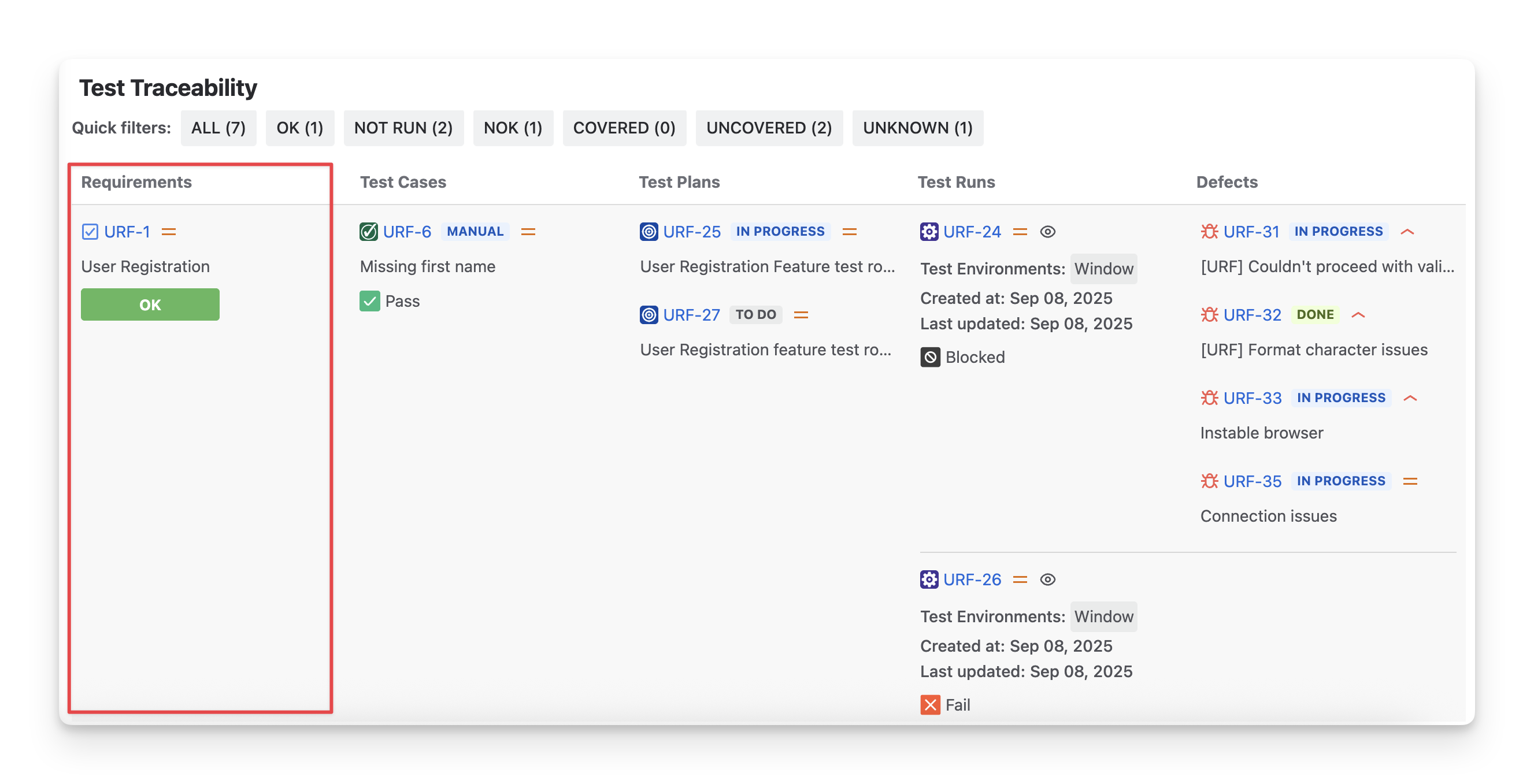 Requirement status: Filter requirements based on their calculated status (NOK; NOT RUN; UNKNOWN; OK; UNCOVERED)