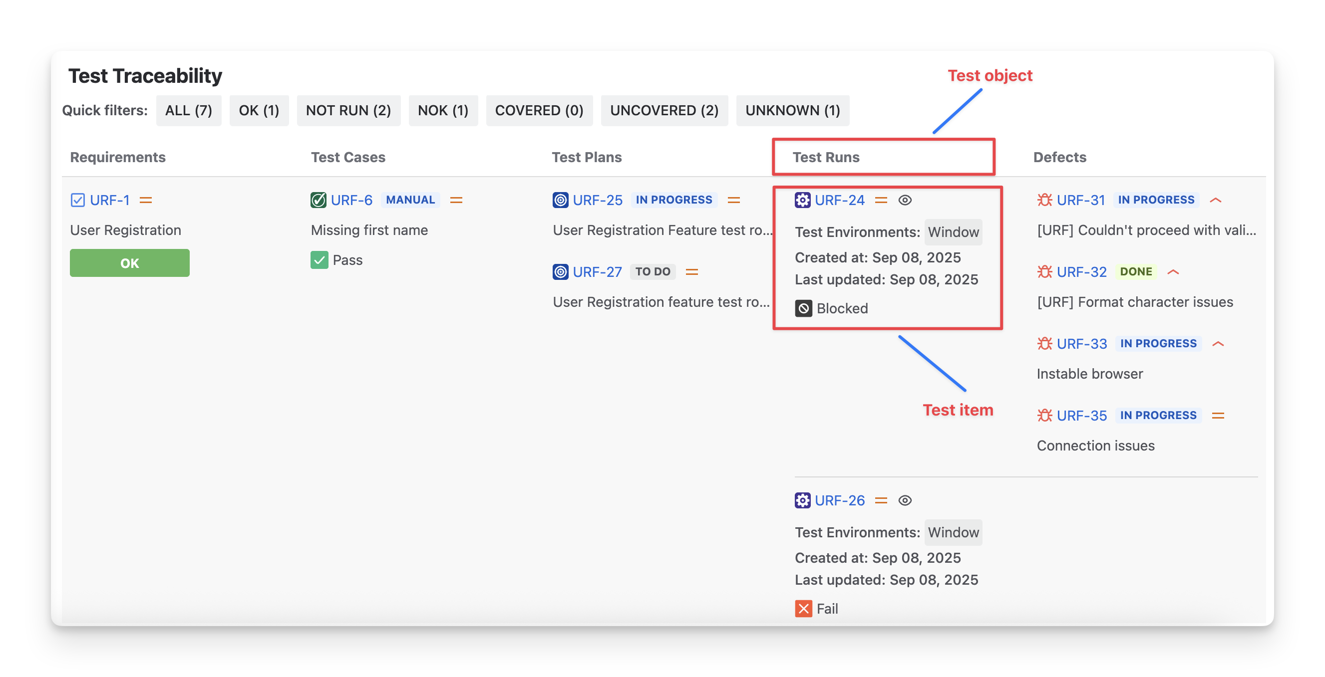 Each test object contains multiple test items, which are individual elements related to the object, such as specific test cases, test executions, or defect records.