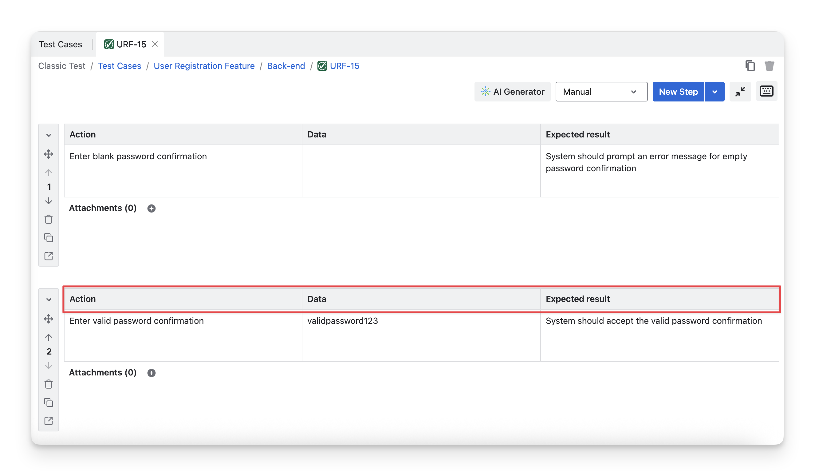 The Step-based test case type (or Manual Test Case) is used for structured, step-by-step testing. Test cases created with this type include clearly defined actions, sample data, and expected results for each step.