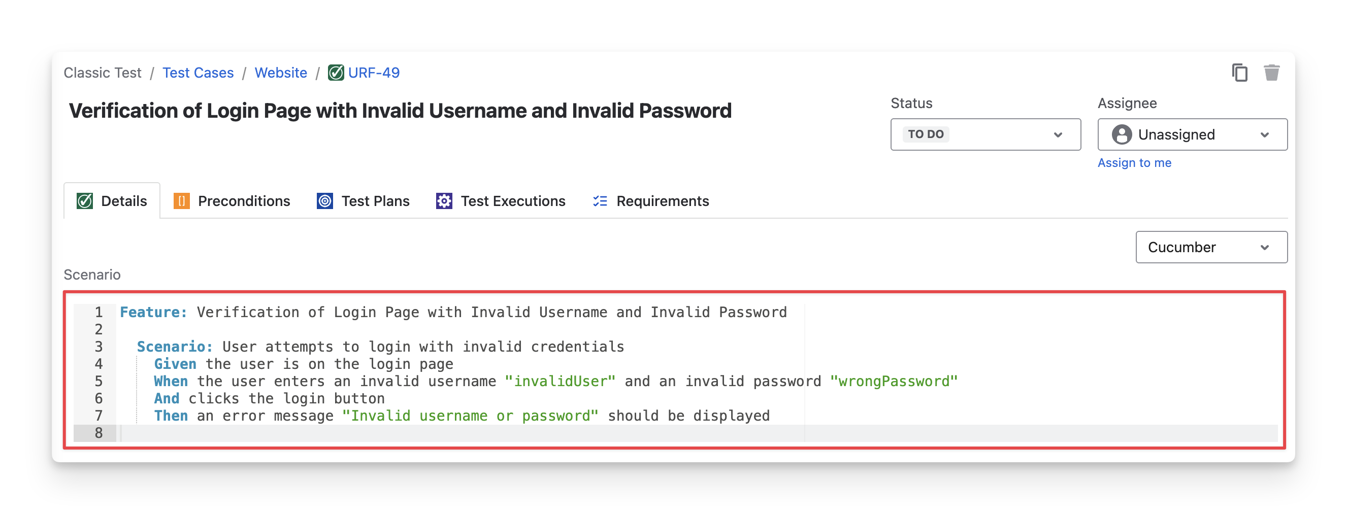 The Cucumber test case type is designed for behavior-driven development (BDD) and automated testing. Test cases are written using the Gherkin (Given–When–Then) format, making them familiar with the technical context and suitable for automation frameworks.