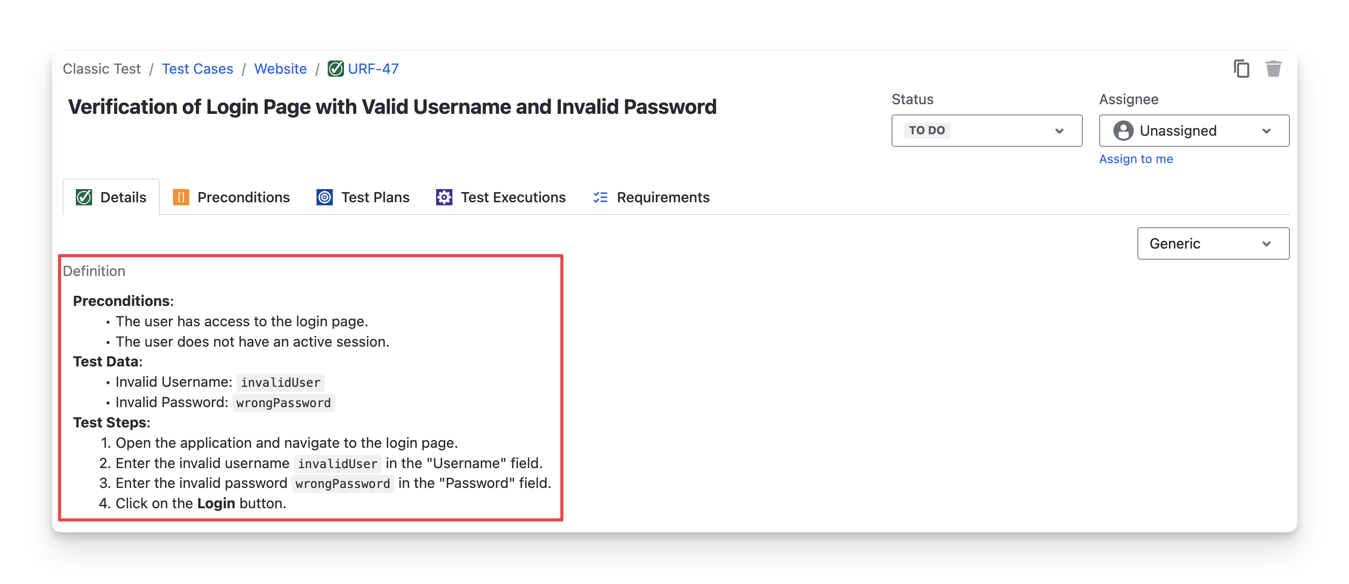 The Unstructured test case type, also called Generic test cases, supports flexible and lightweight testing. Test case details are written as free text, allowing testers to explore features without strict instructions.