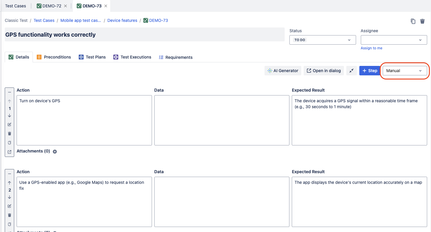 Unlike unstructured tests, step test cases have a more detailed structure - usually referred as Manual . They include all the key elements of a test case, such as actions, input data, expected results, and attachments, hence provide a comprehensive guide for executing the tests.