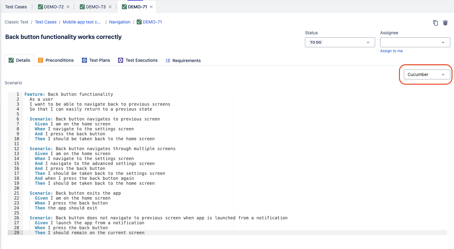 Automated Testing | Best suited for tests tied to automated frameworks like Cucumber, SpecFlow, or Behave, where Gherkin scripts directly translate to automated test scripts. |