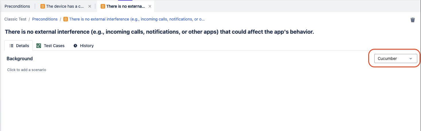 The Gherkin type, however, retains the standard structure of Gherkin test cases. It consists of a series of Given, When, and Then statements, allowing users to define detailed preconditions. Additionally, all predefined keywords are automatically suggested as you type.
