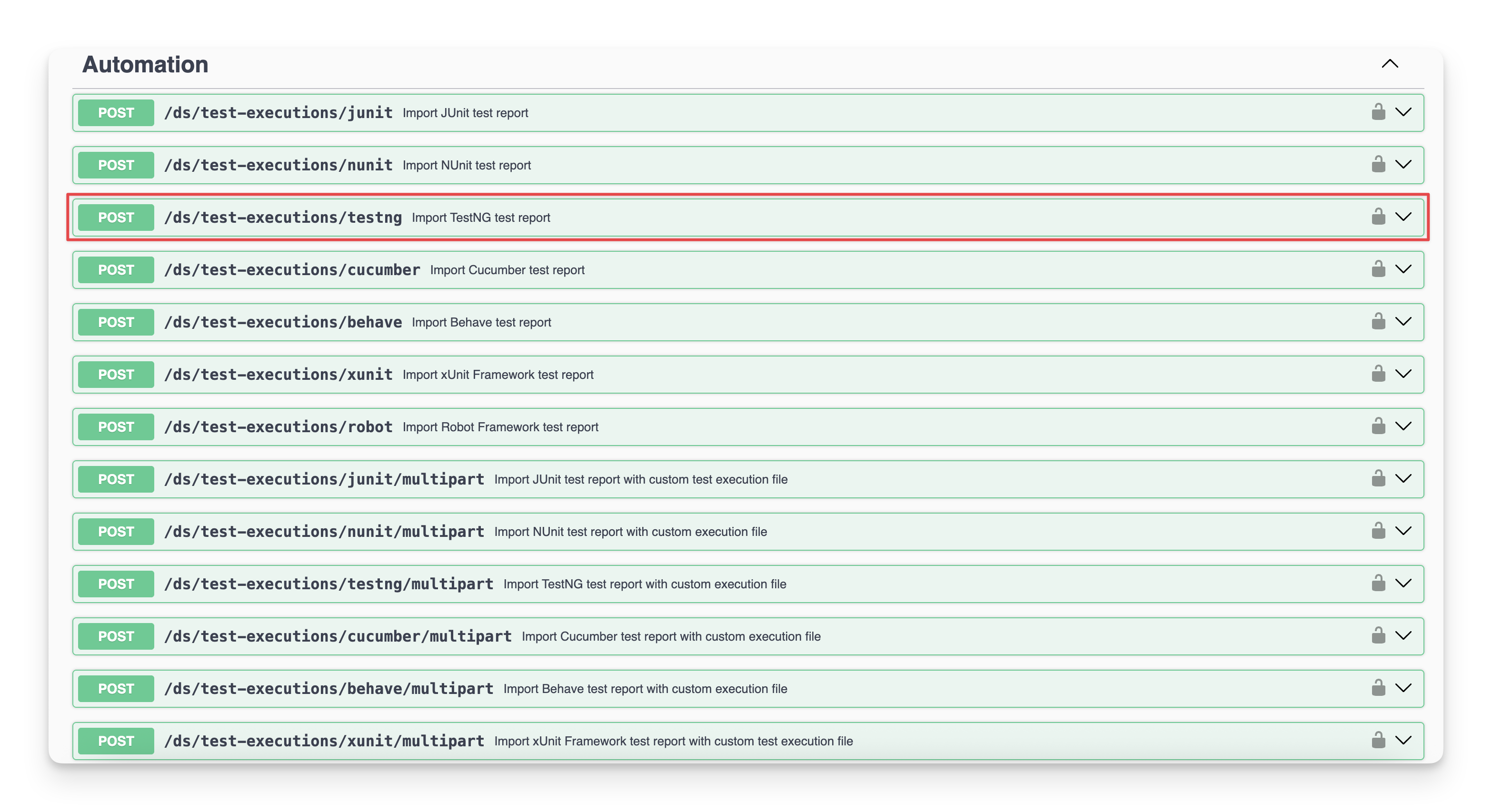 You can locate the endpoint at the POST/ds/test-executions/testng in the API document.