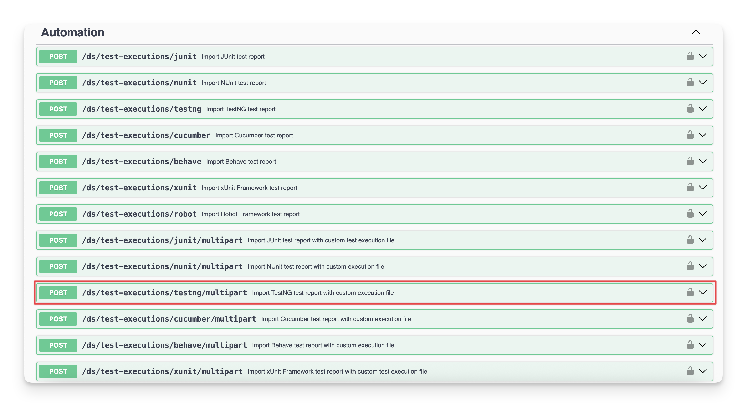 You can locate the endpoint at the POST/ds/test-executions/testng/multipart in the API document.