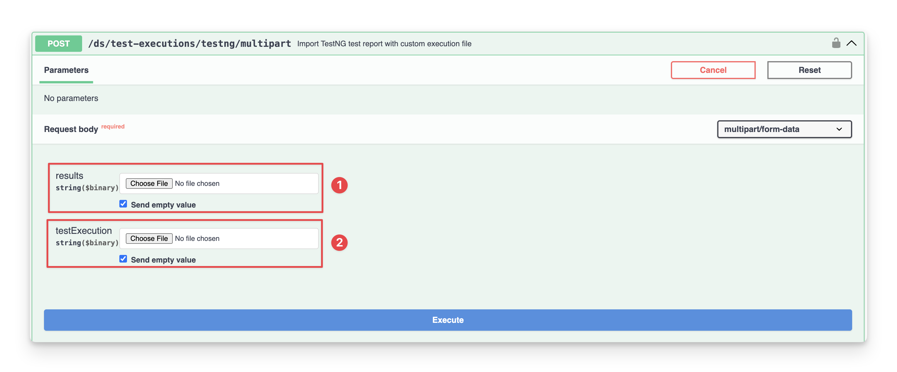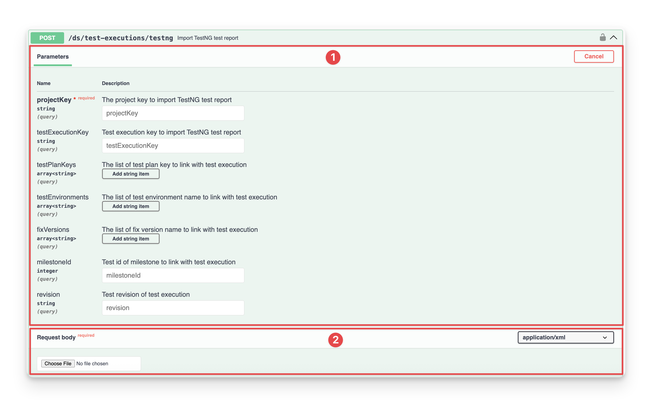Request body: where you can input an XML file, which is a TestNG report that is going to be imported.