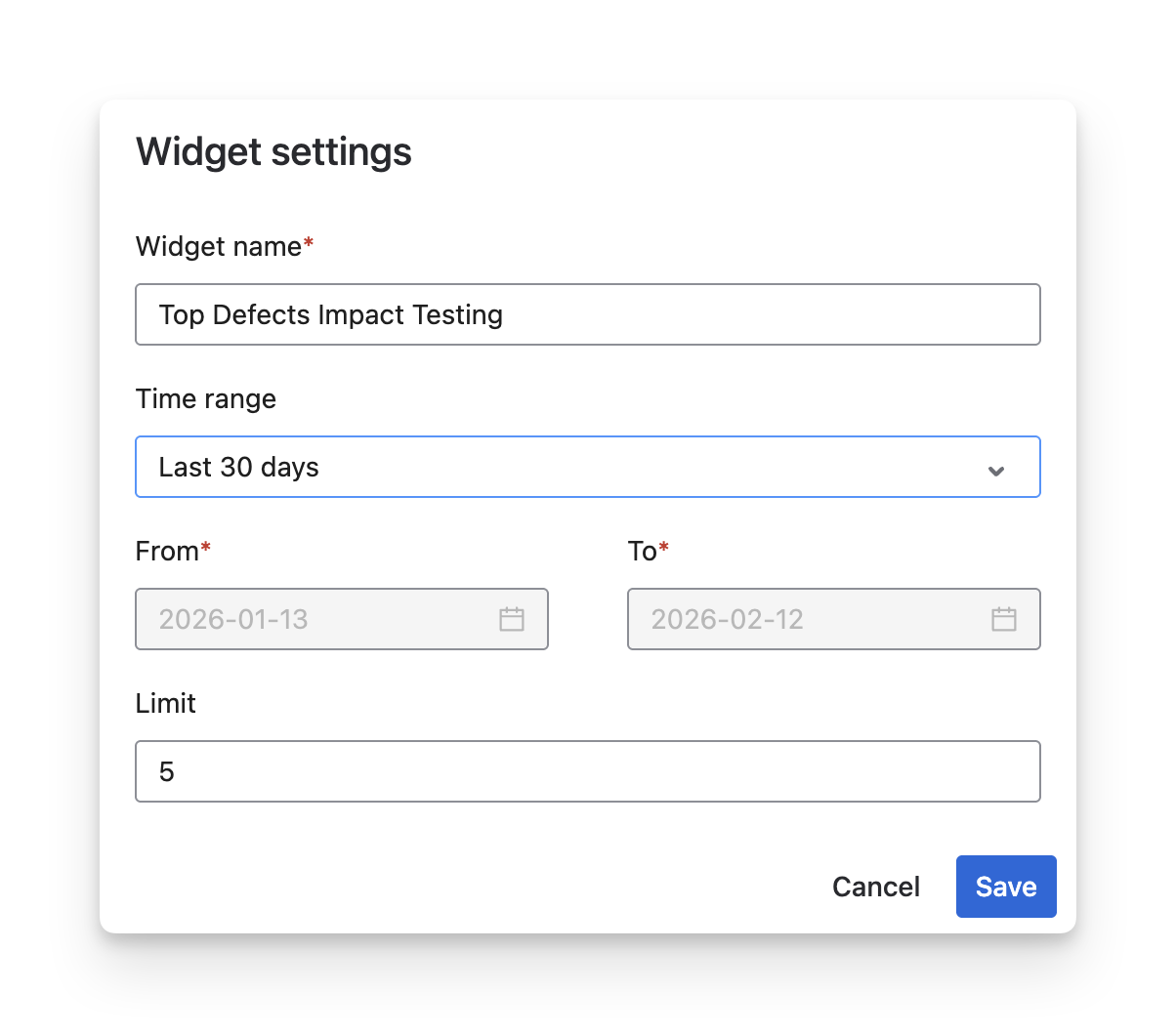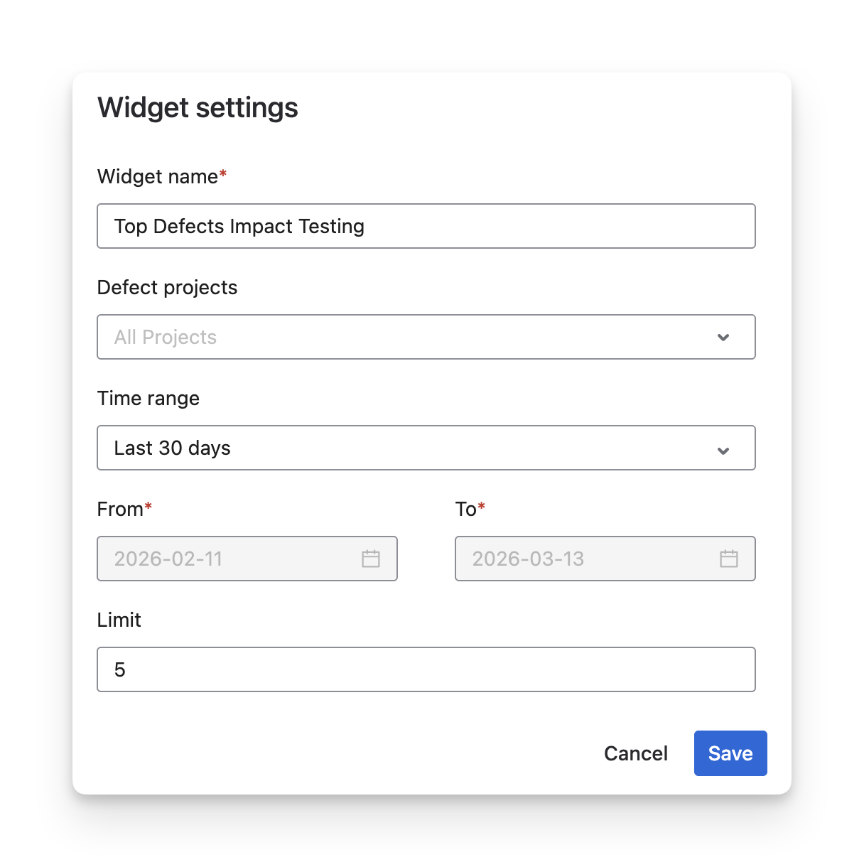 The Top Defects Impact Testing widget is ideal for QA teams who need to track the most common defects affecting test execution. It allows teams to quickly identify critical defects, monitor their status (TODO IN PROGRESS DONE), and assess their impact based on the number of linked test cases. With this widget, you can: