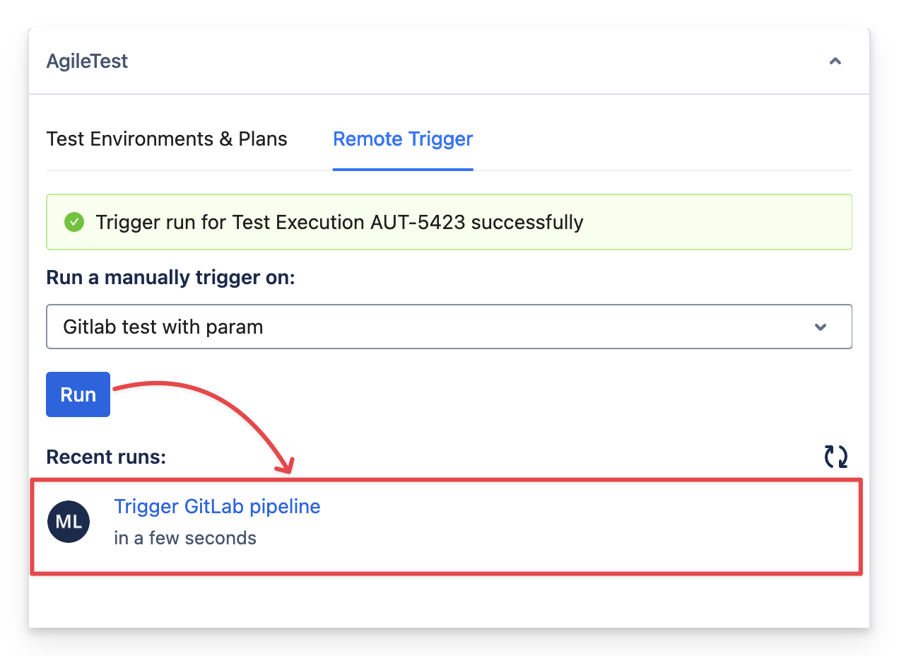 On the right panel of the issue screen, under the Agile Test section, you will see the trigger you just created. Simply click Run to start your pipeline.