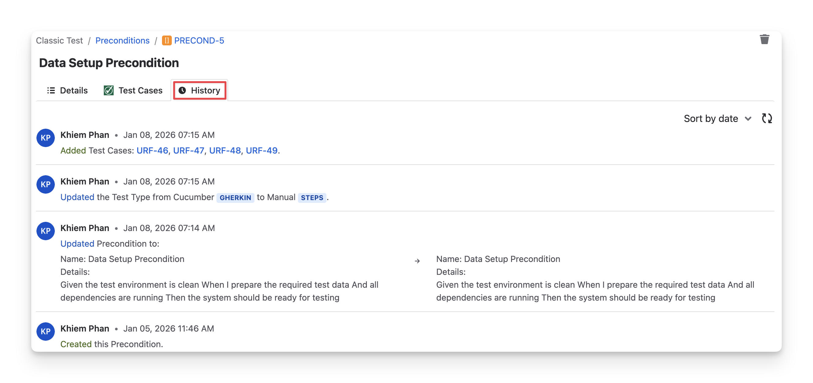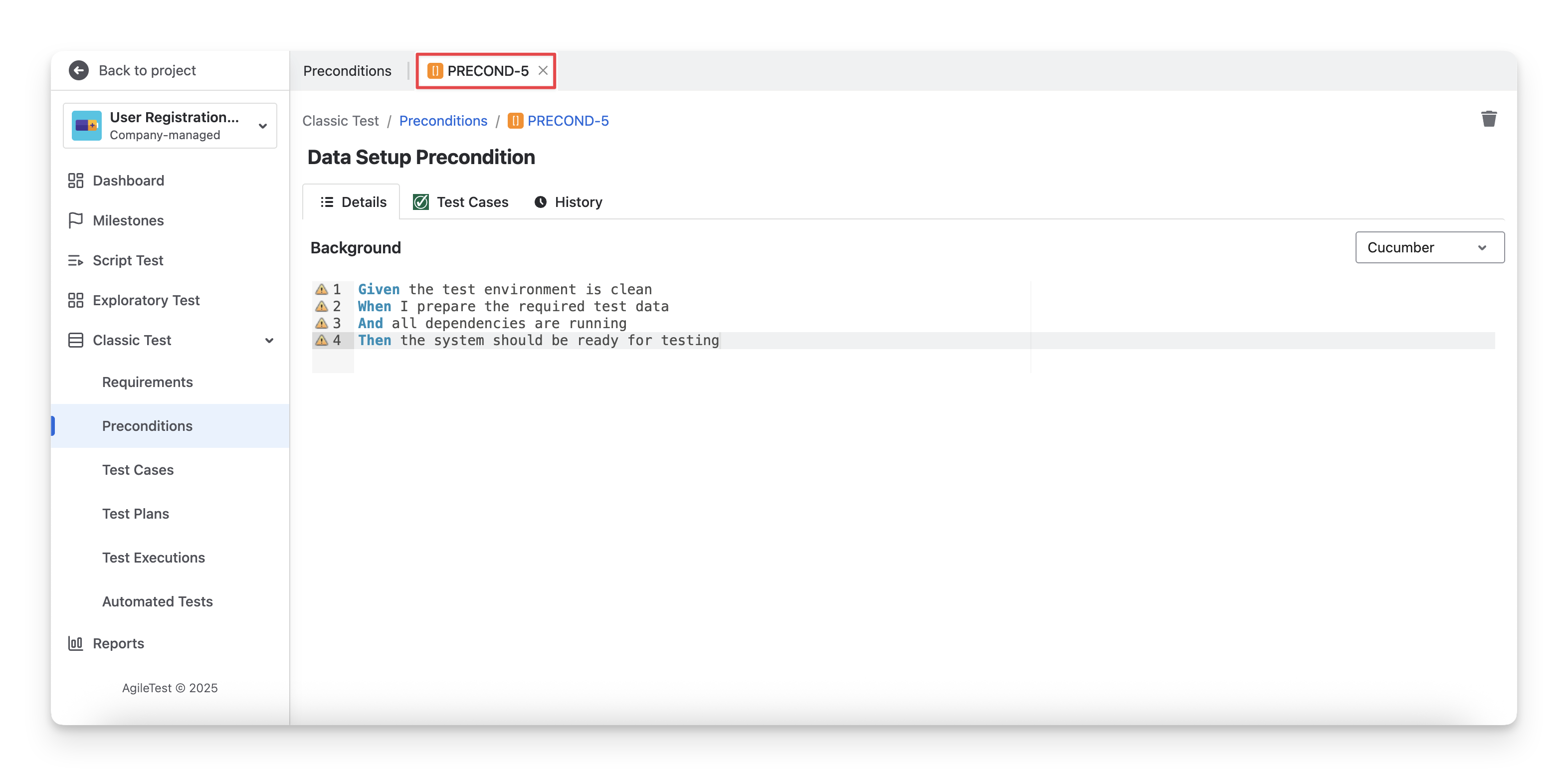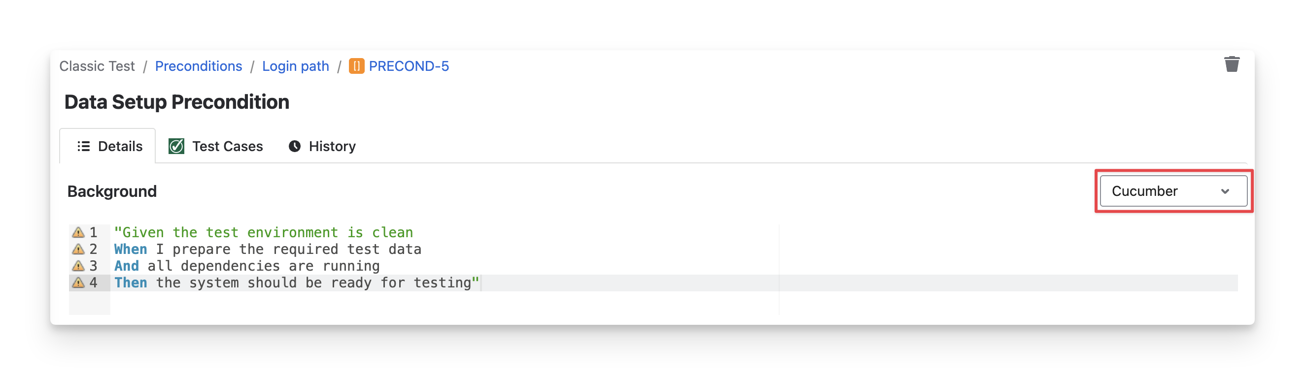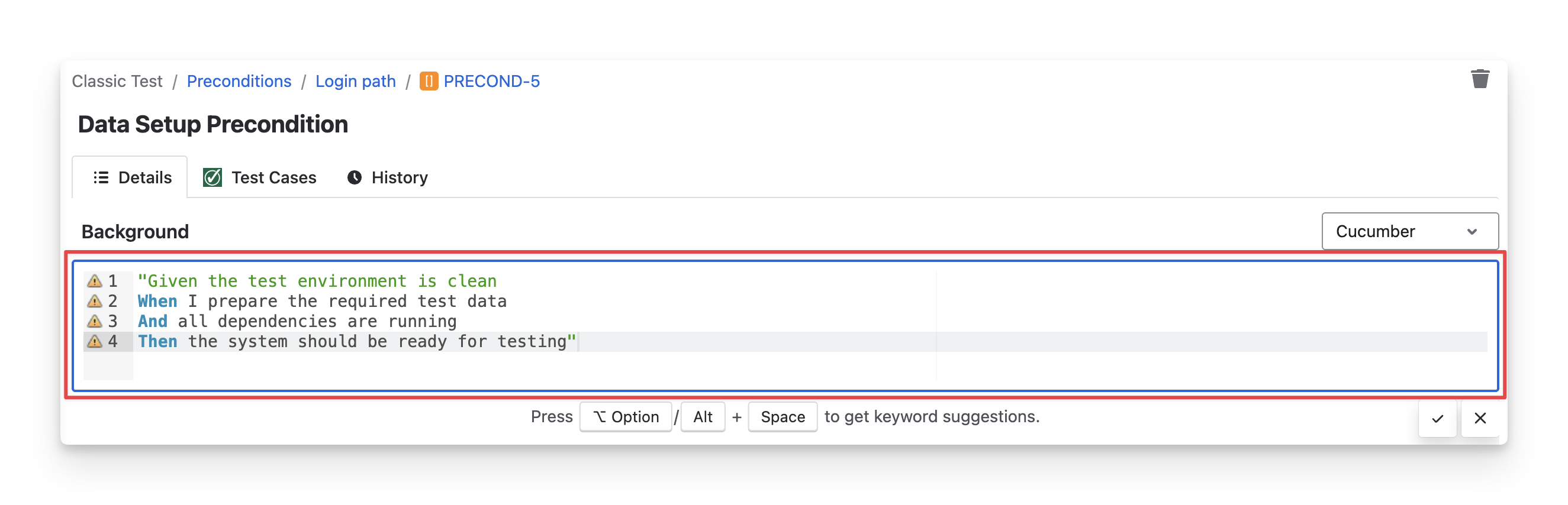 In the Details tab, you can view the precondition type and its current setup. This tab allows you to update precondition details, as well as change the precondition type if needed, ensuring it stays aligned with your testing approach.