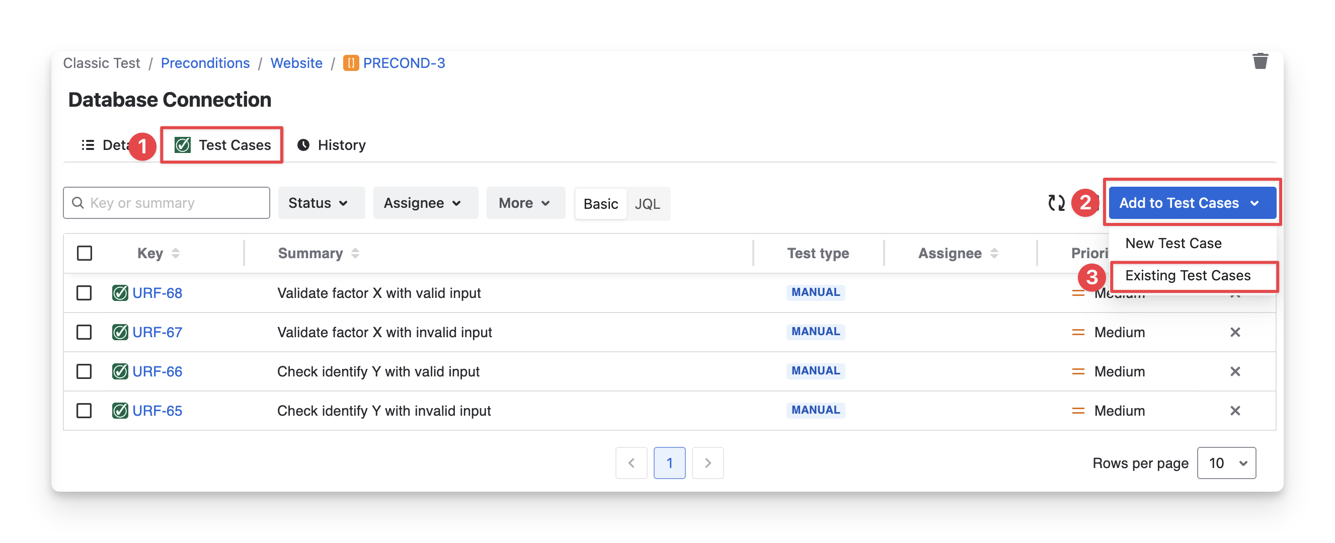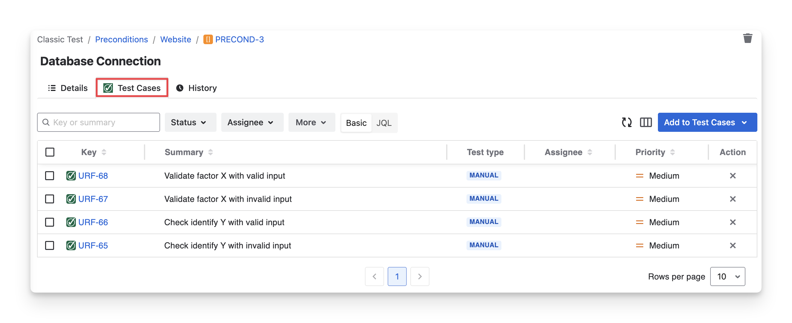 In the Test Cases tab, you can view which test cases are linked with this precondition. This helps you track which required conditions, data, or environment setup must be fulfilled before executing those test cases.