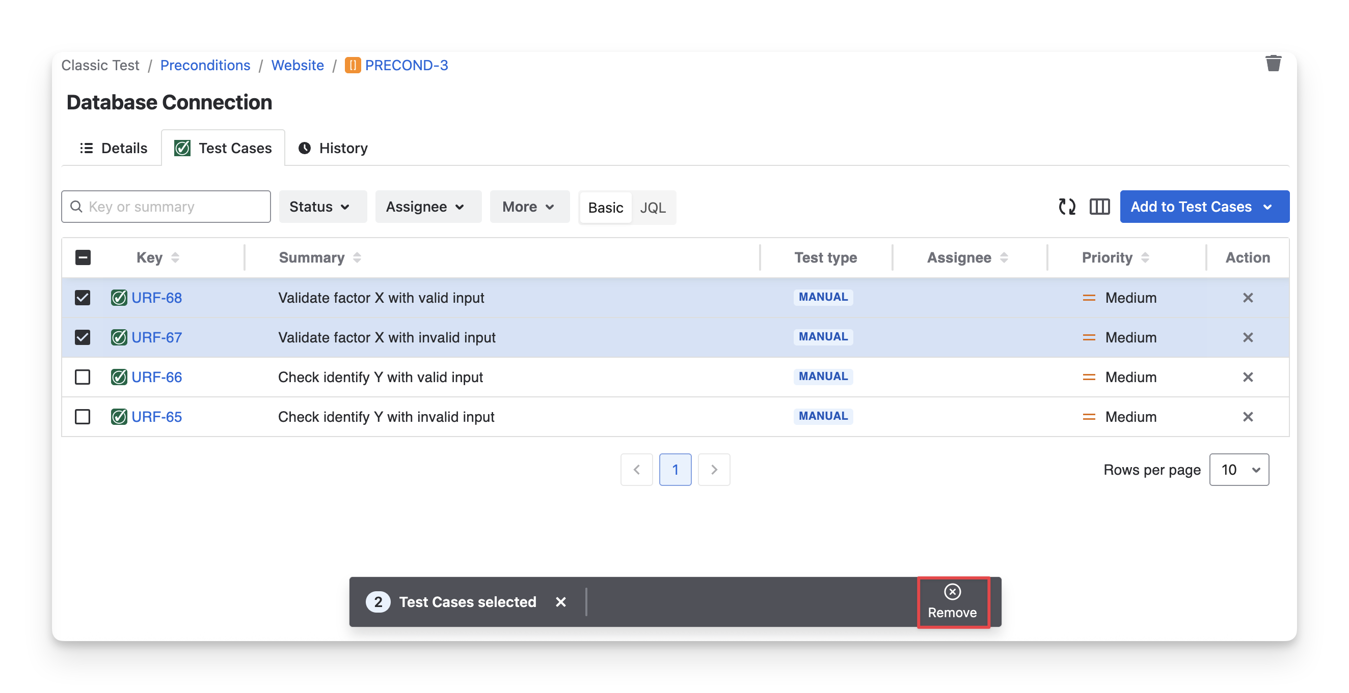To unlink preconditions from test cases, select the preconditions you want to remove and click the “Remove” button in the toolbar. Or you can also click the “X” button to remove a single test case.