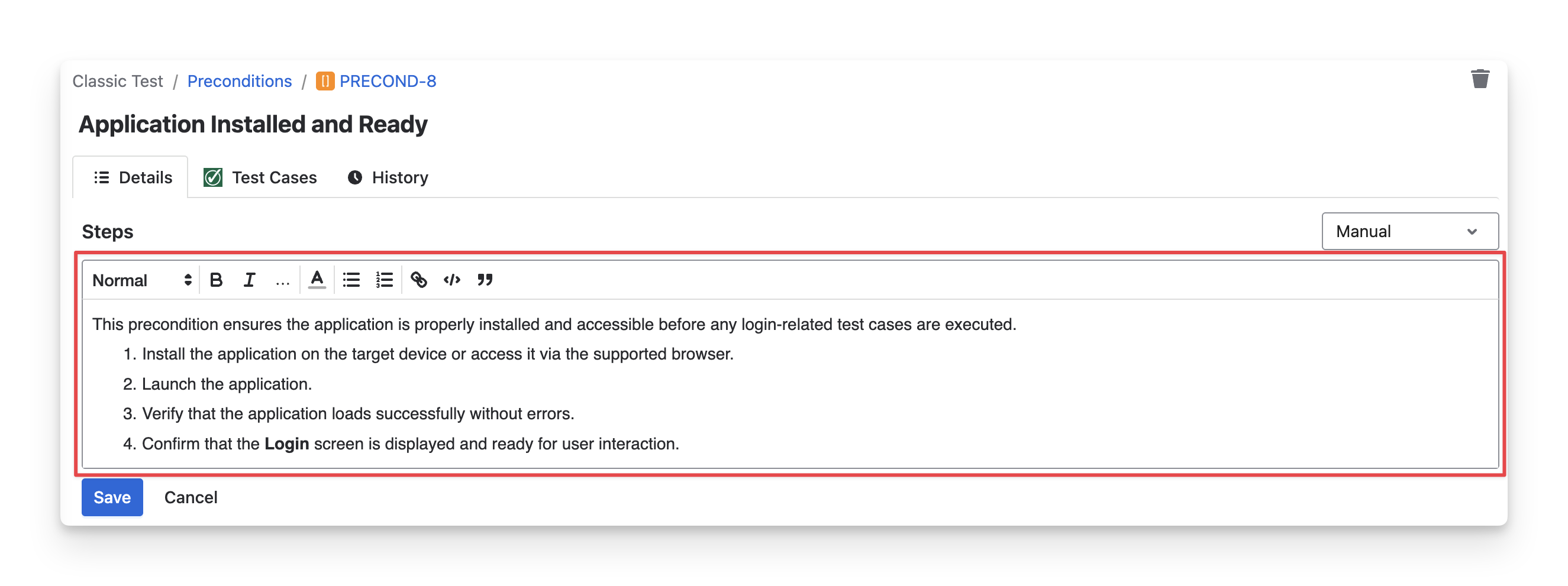 For the Manual Precondition Type, you can edit the created steps in the system space. Click the “Save” button to apply your changes.