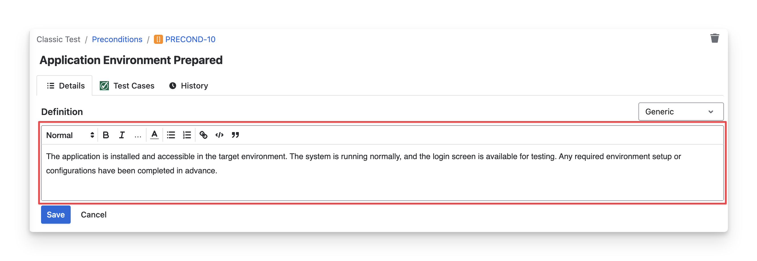 For the Generic Precondition type, you can edit the content in the text field to update notes, configurations, or checklist information. Click the “Save” button to apply your changes.