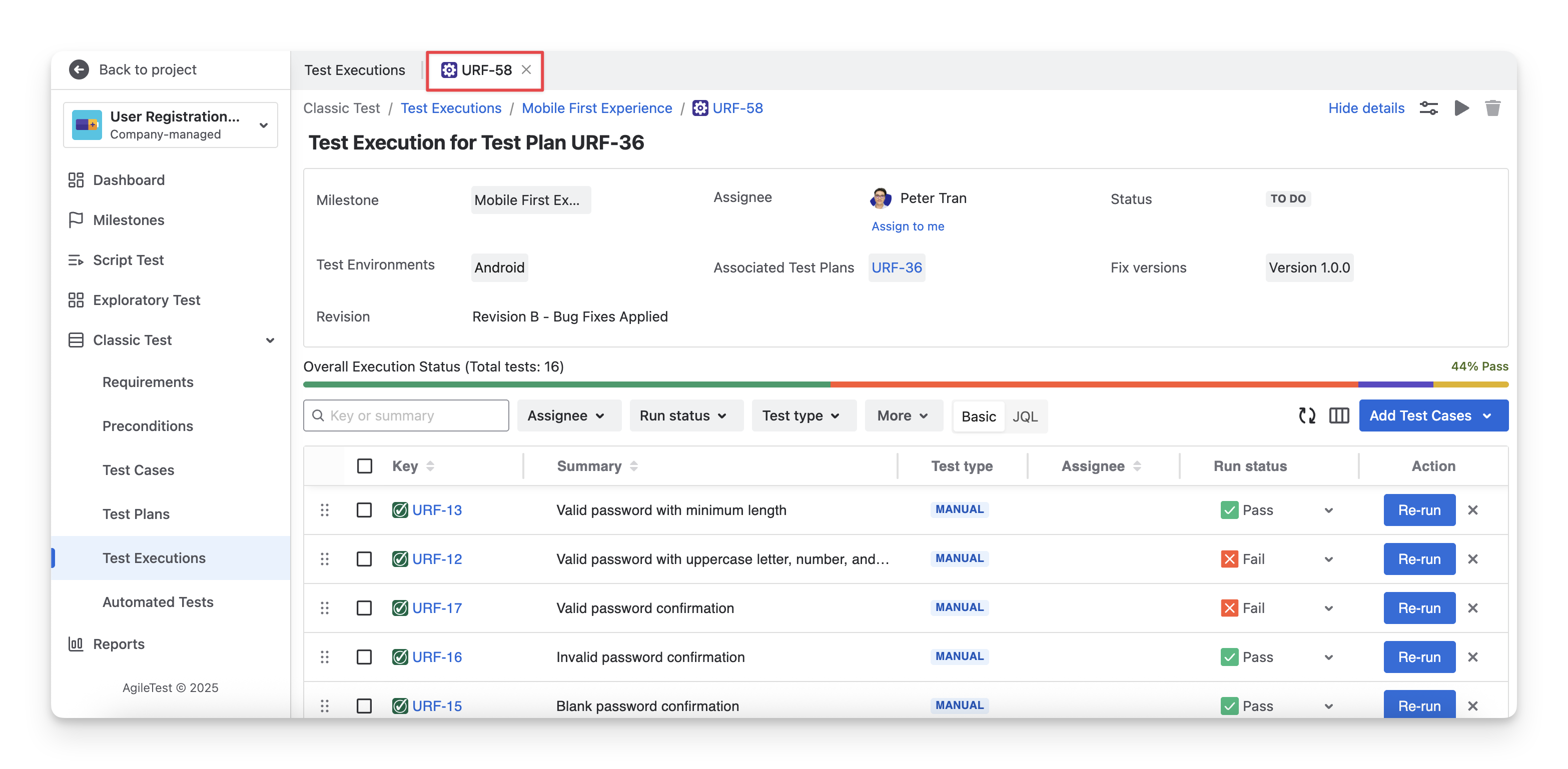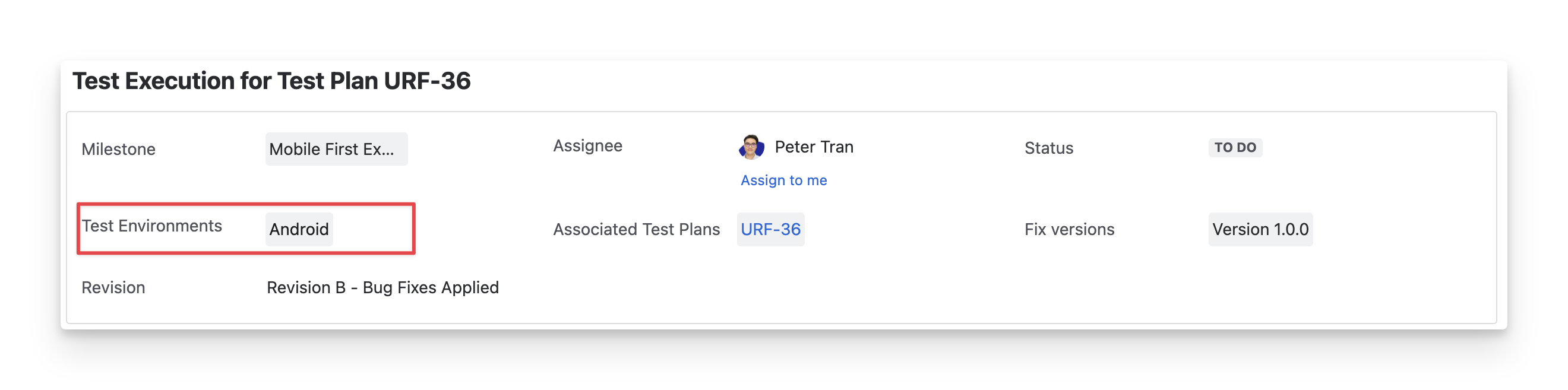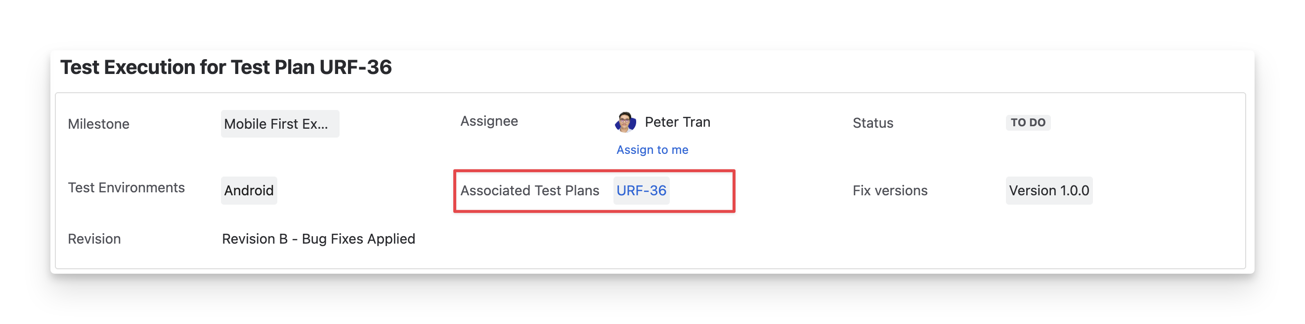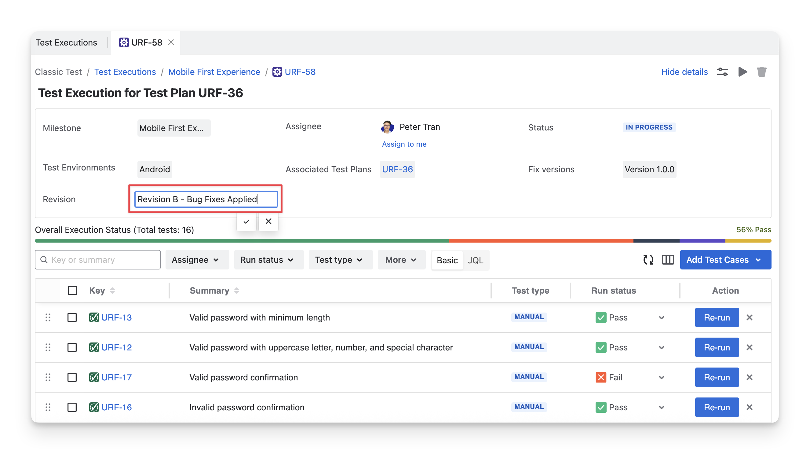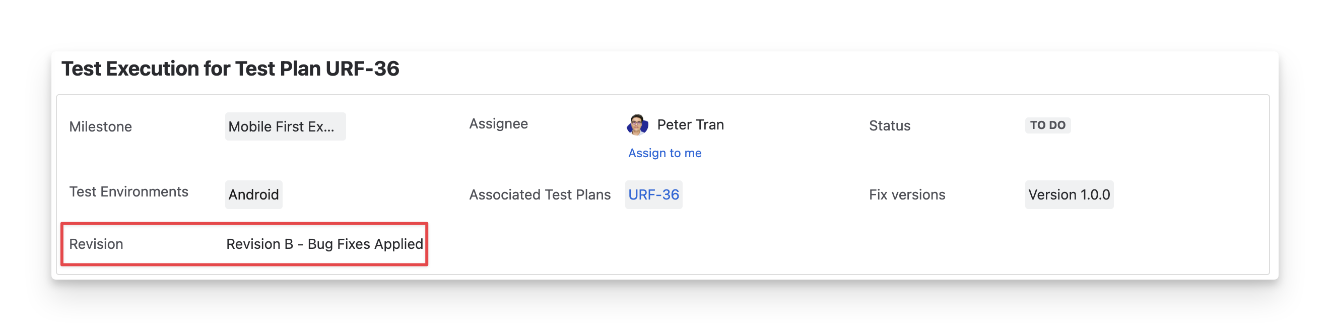 The Revision displays the Jira revision that tracks the changes made to the test execution over time.