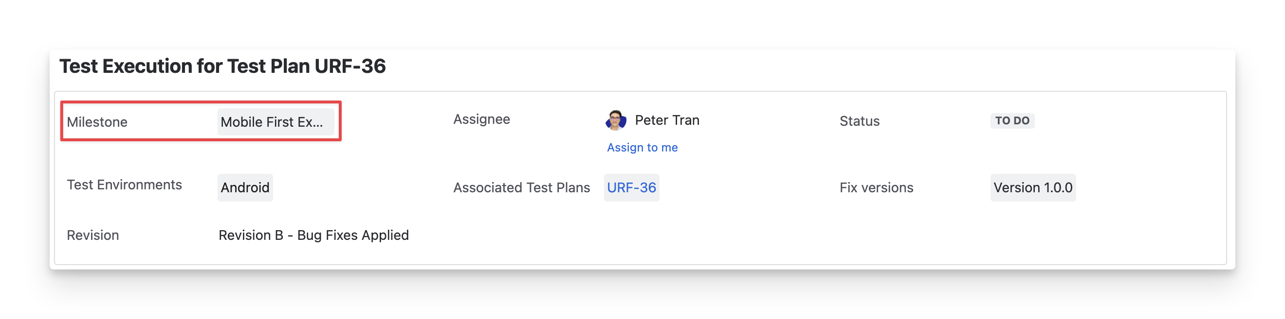 The Milestone box shows the milestone to which this test execution is linked. You can click on this field to select and change it to a different milestone.