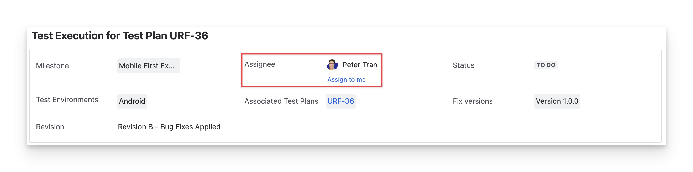 The Assignee box shows who is responsible for this test execution. To change the assignee, click the dropdown and select a team member.