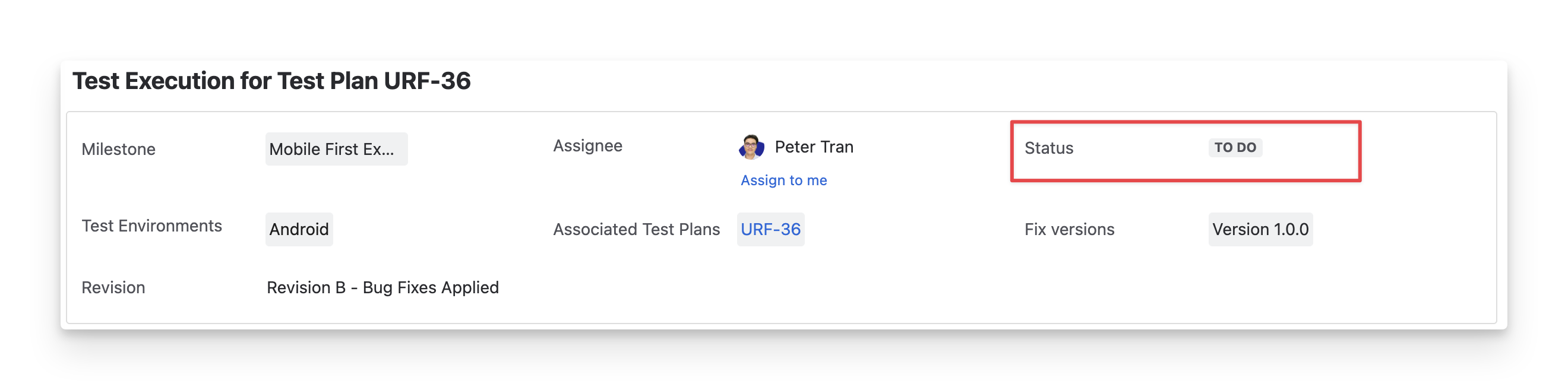 The Status box shows the Jira status of the test execution ticket (TODO; IN PROGRESS; DONE). It reflects the progress of the test execution in your team's workflow on the Jira board.