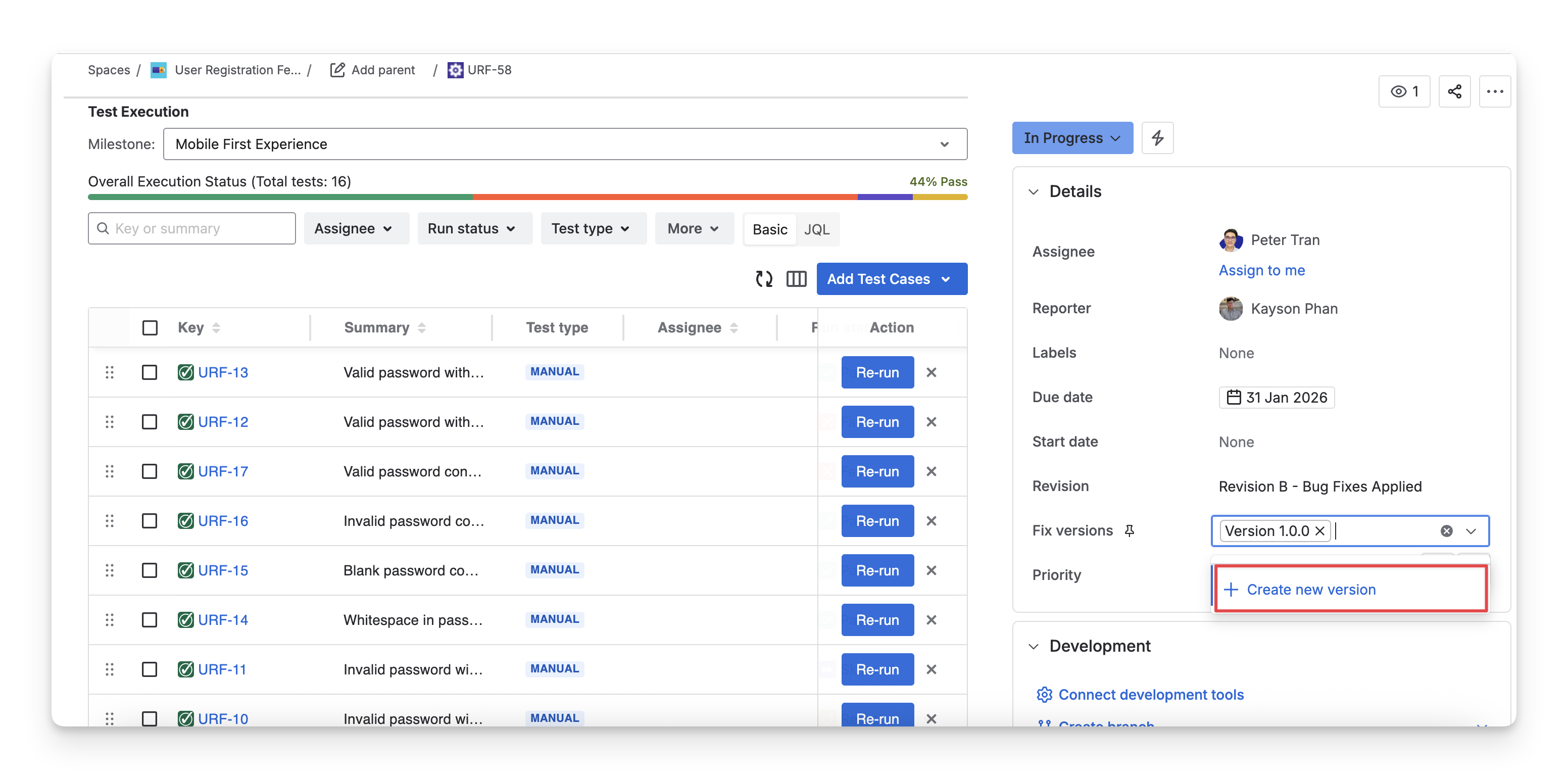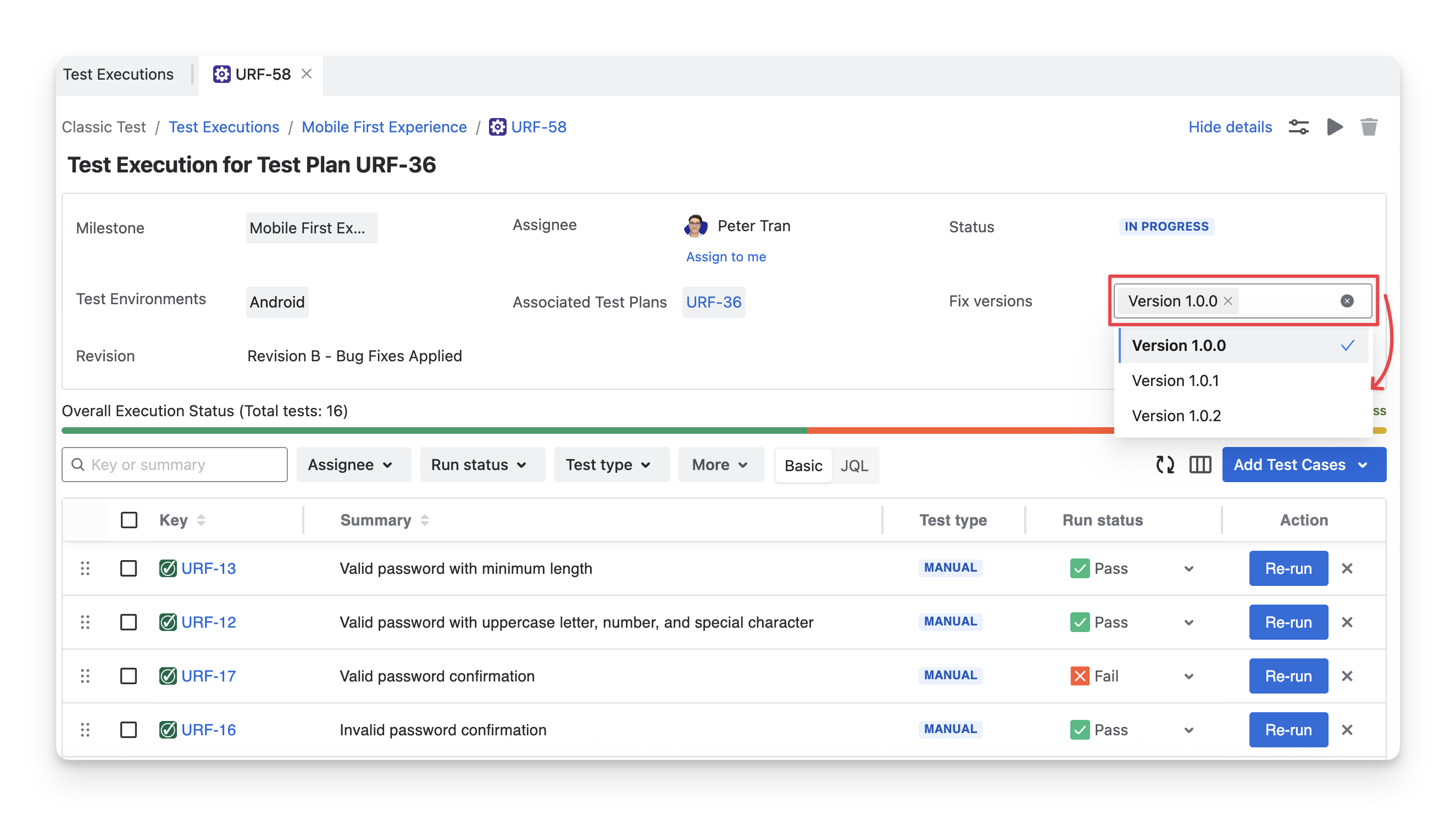 To change the fix version, select the dropdown to associate the test execution with a different version.