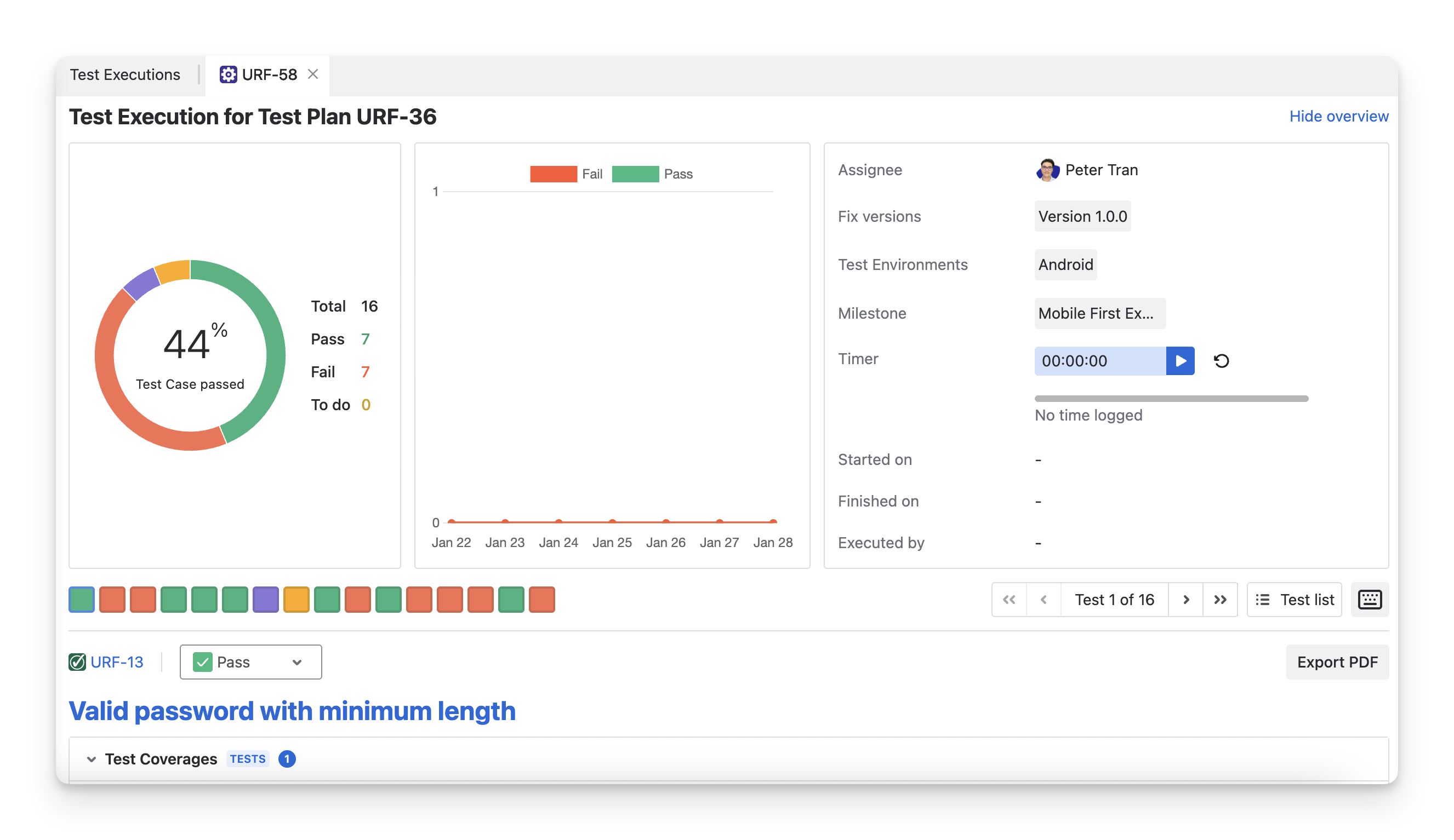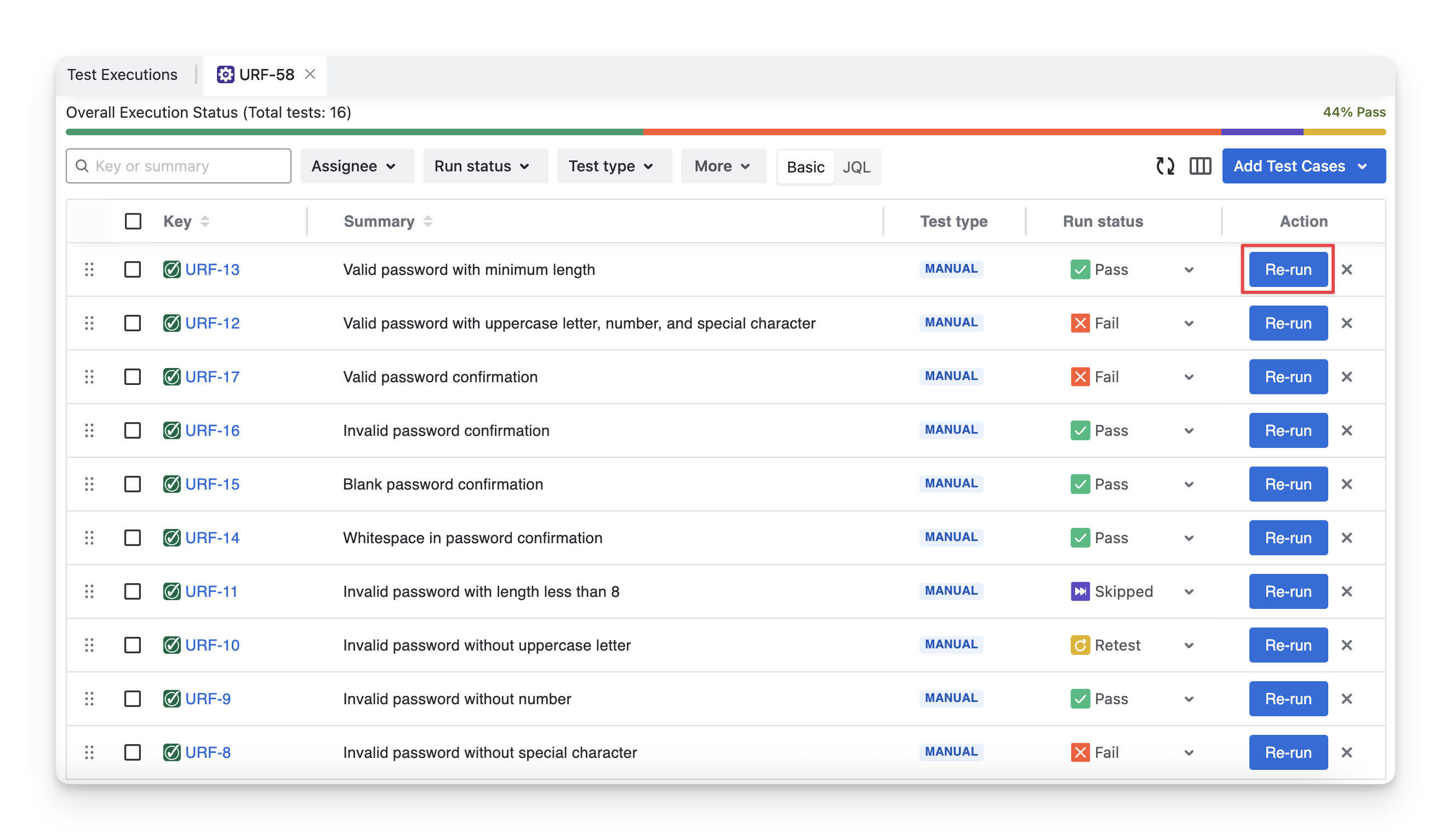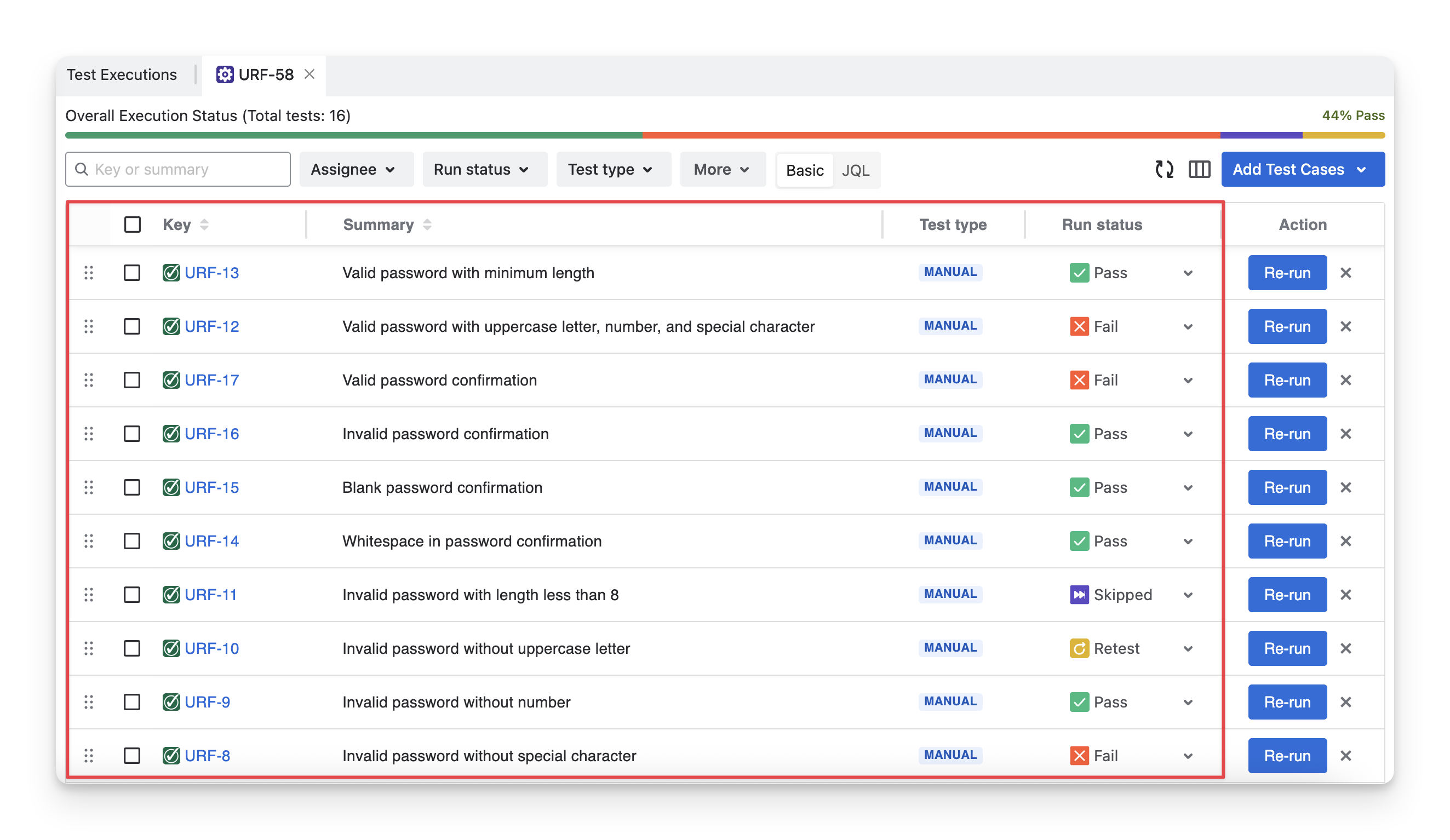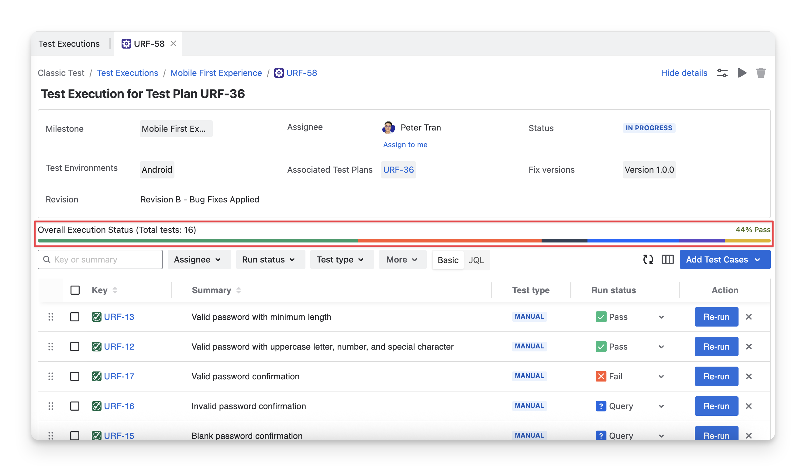 Under the Overall Execution Status progress bar, there is a list of test case show you detailed information of each test case, such as its key, summary, … and run results.