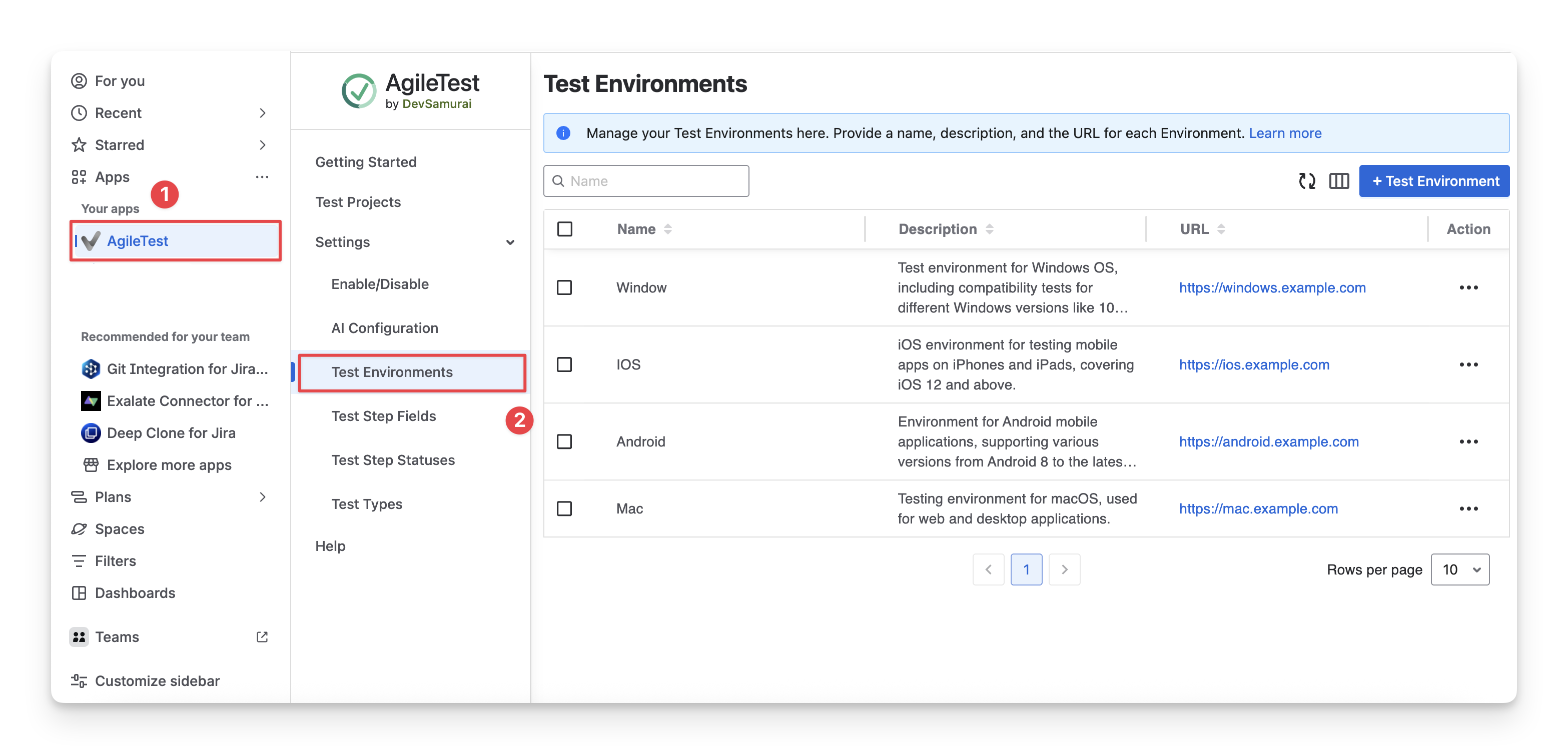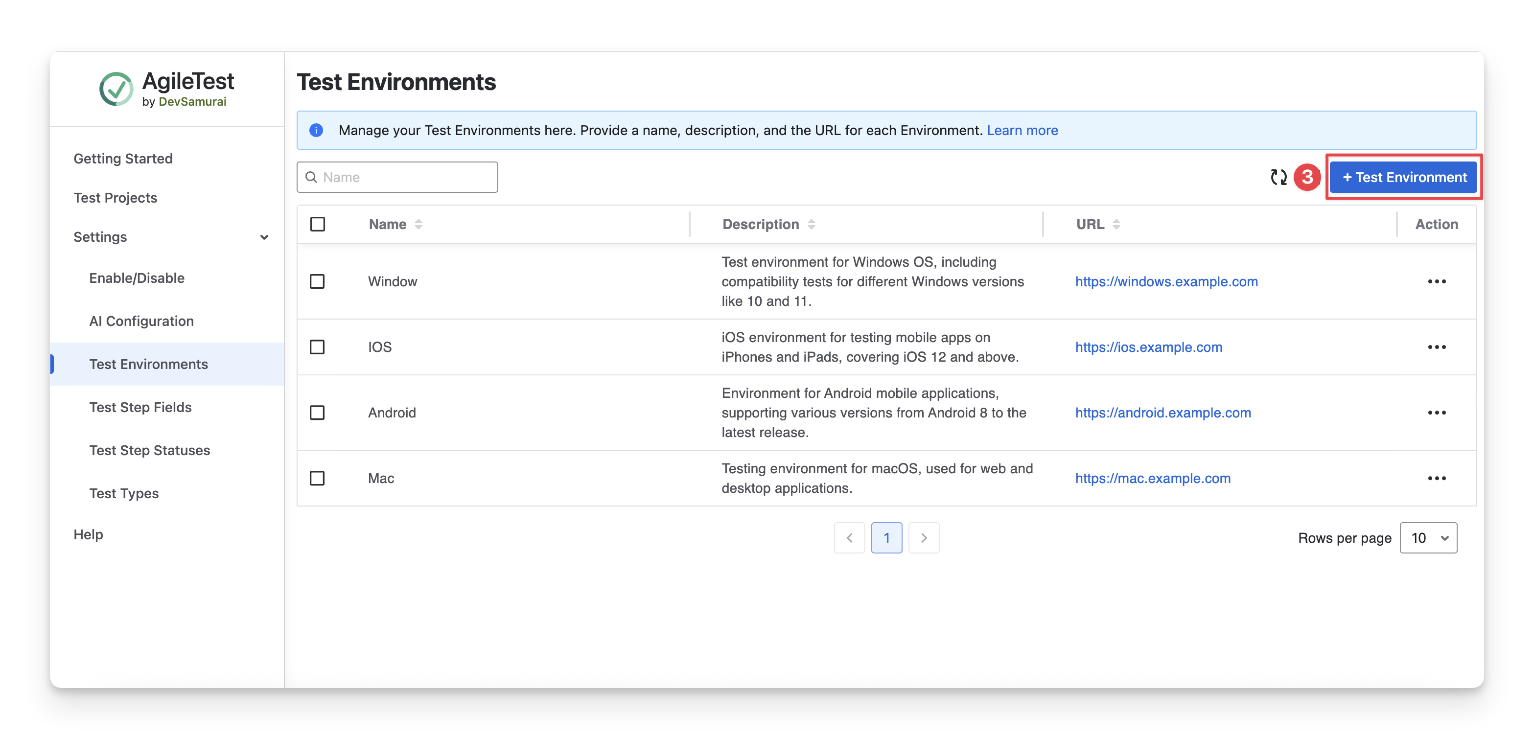 Click on the “+ Test Environment”. Here, you can edit the name, description, and URL for each test environment.