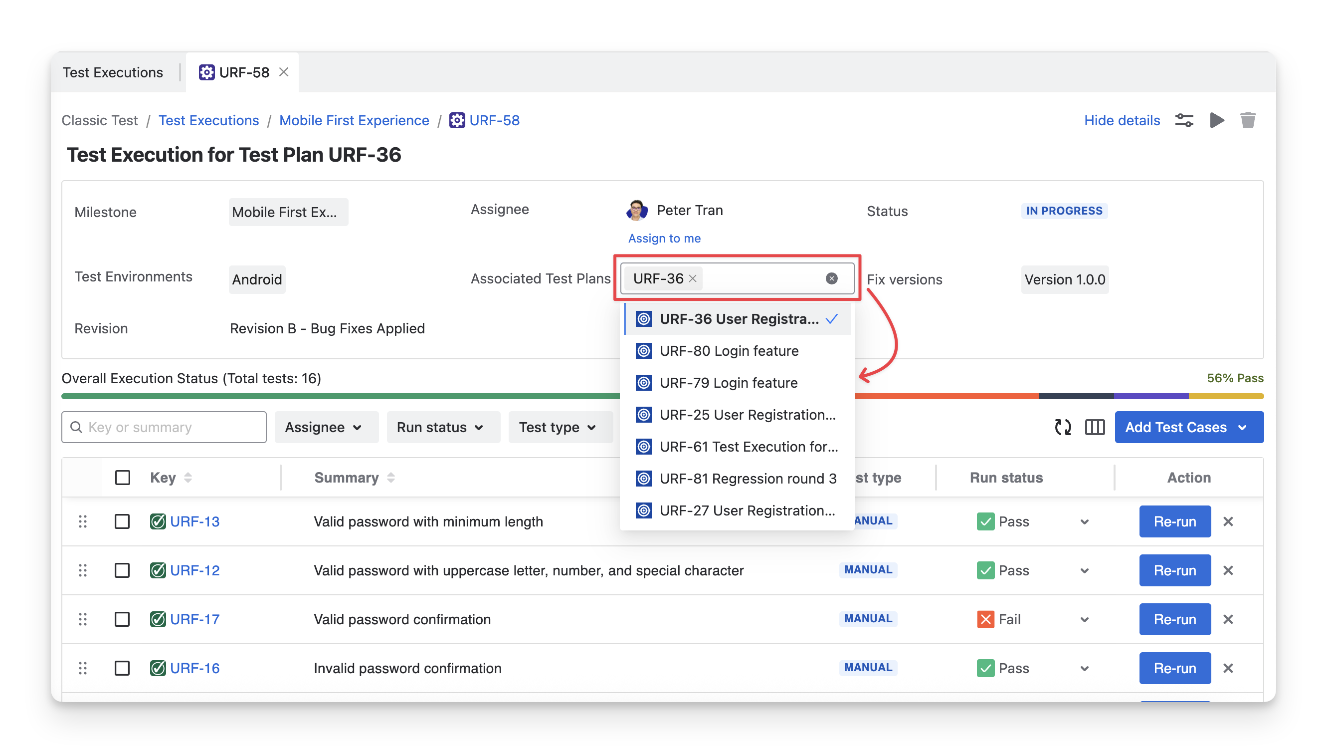 To change the linking relationship with other test plans, click on the dropdown and select the preferred test plans.