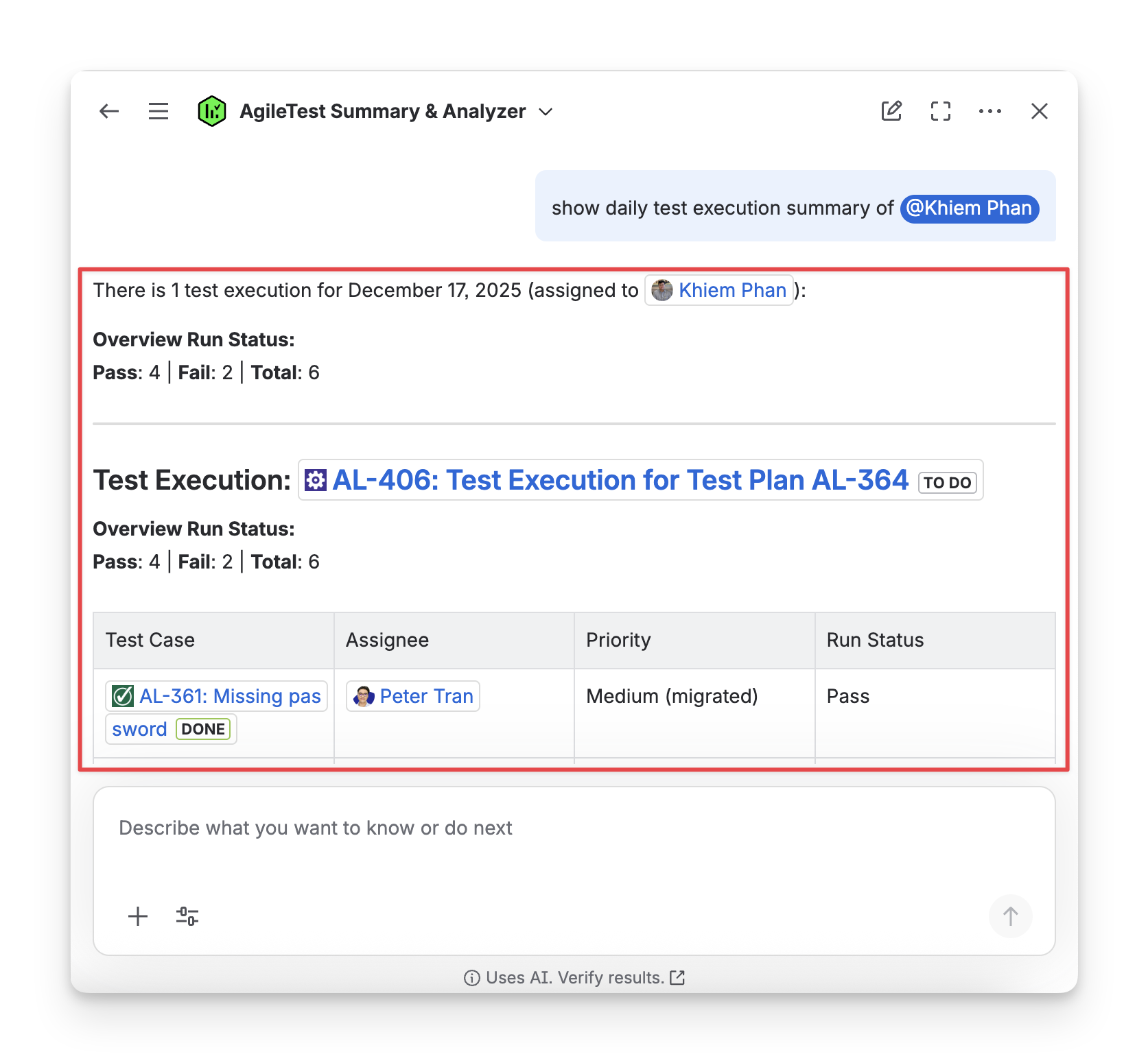 AgileTest Agent summarizes test executions for specific members