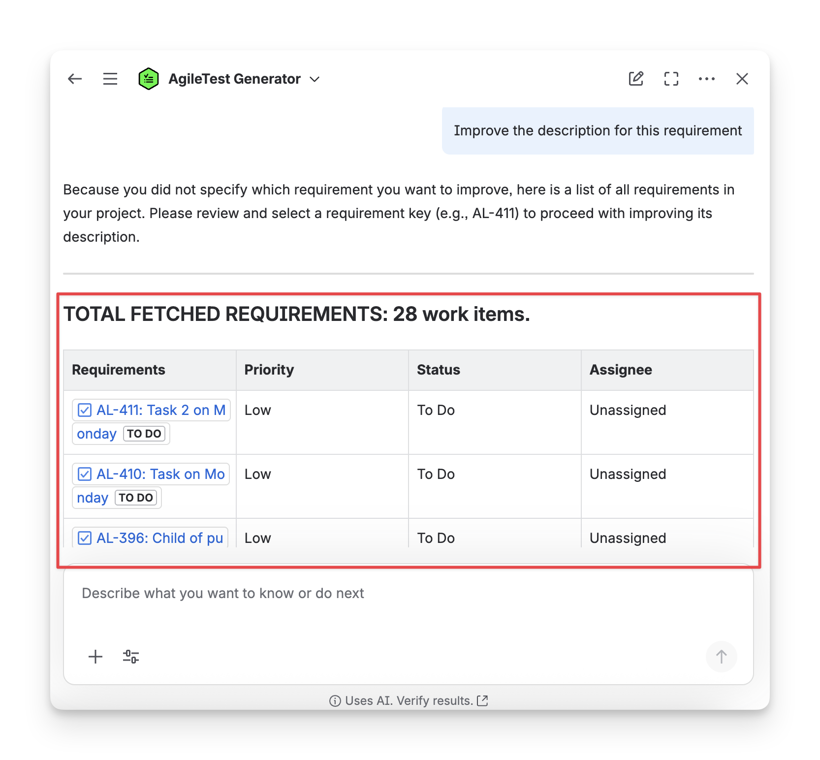 When you ask a general command to the AgileTest Agent without Requirement keys, such as: improve the description for this requirement, the Agent will provide you a list of existing requirements so that you can select which requirements to improve descriptions.