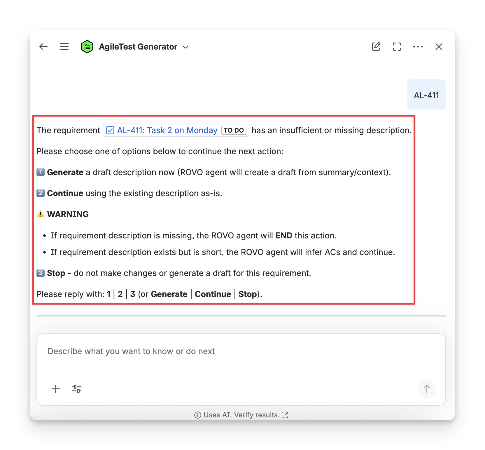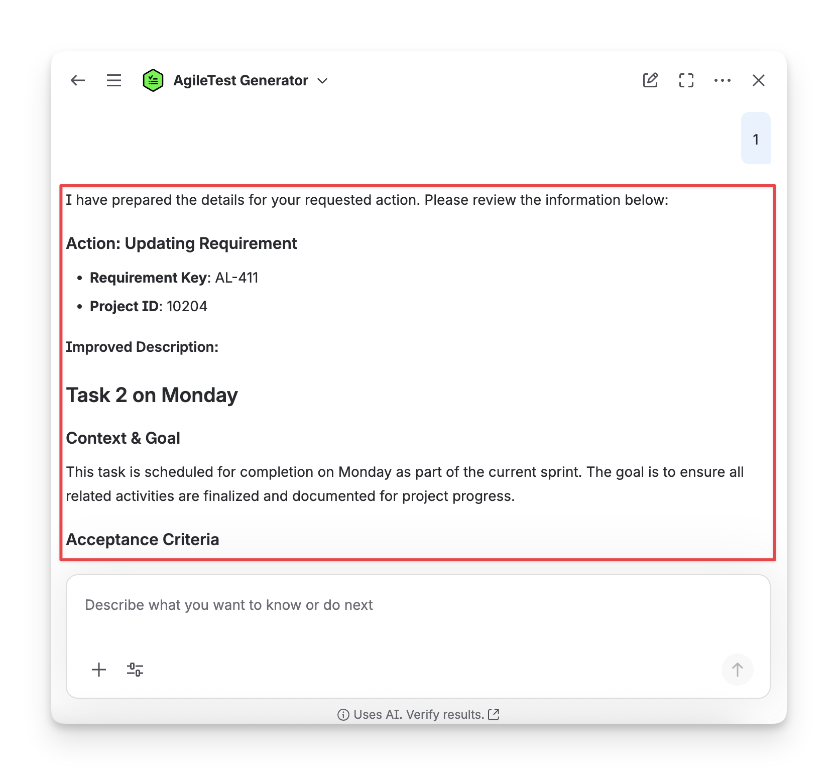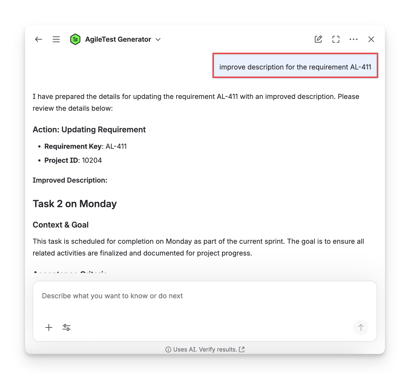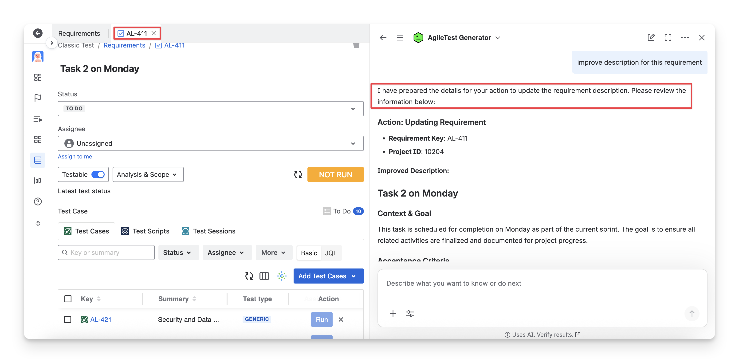 When you ask the AgileTest Agent to improve the description for a specific requirement with the requirementKey, for example, improve the description for the requirement AL-411, the Agent will generate a detailed description for you to edit.