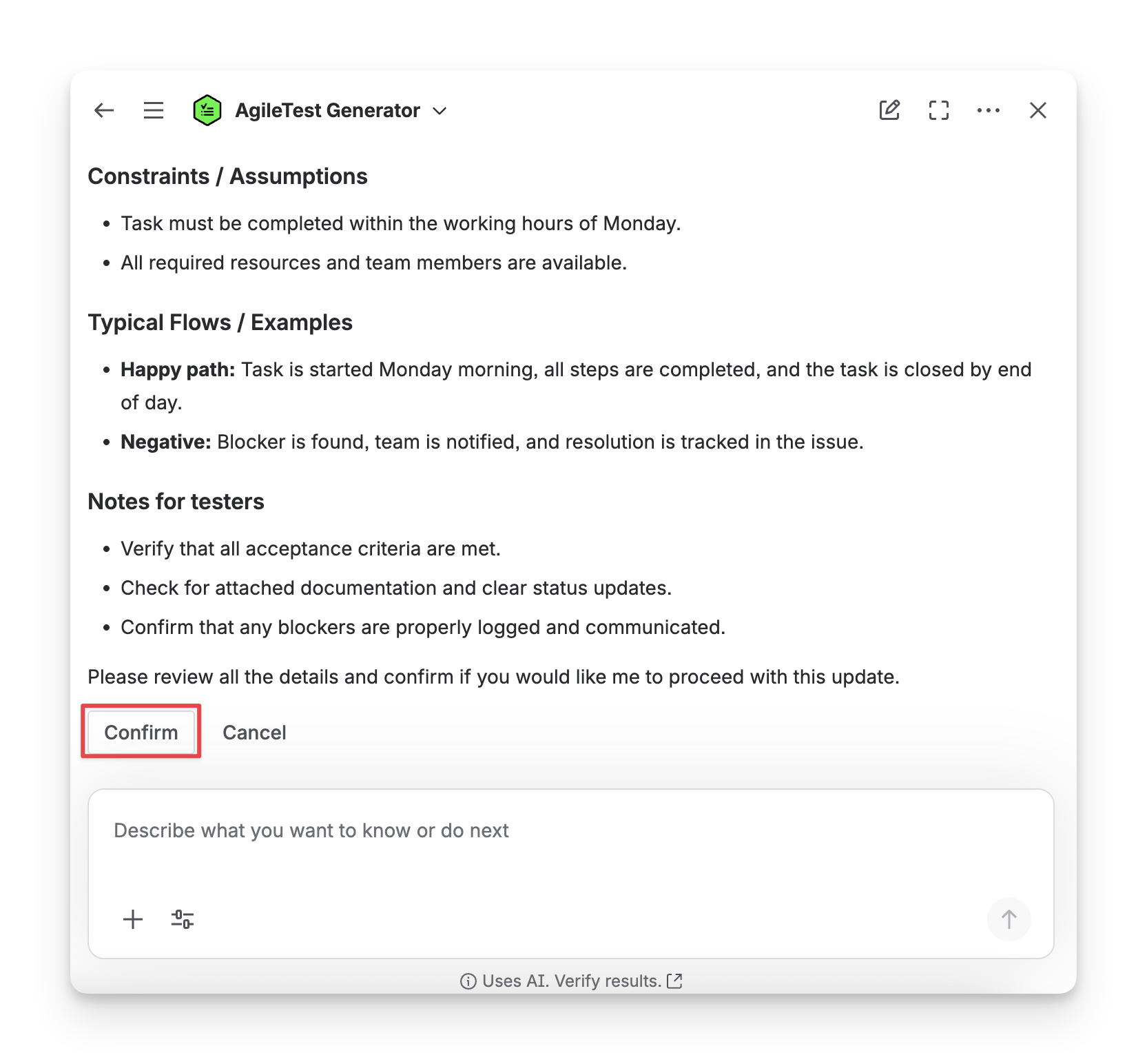 You can ask the Agent to modify the description until it matches your preference. Click “Confirm” to save your changes.