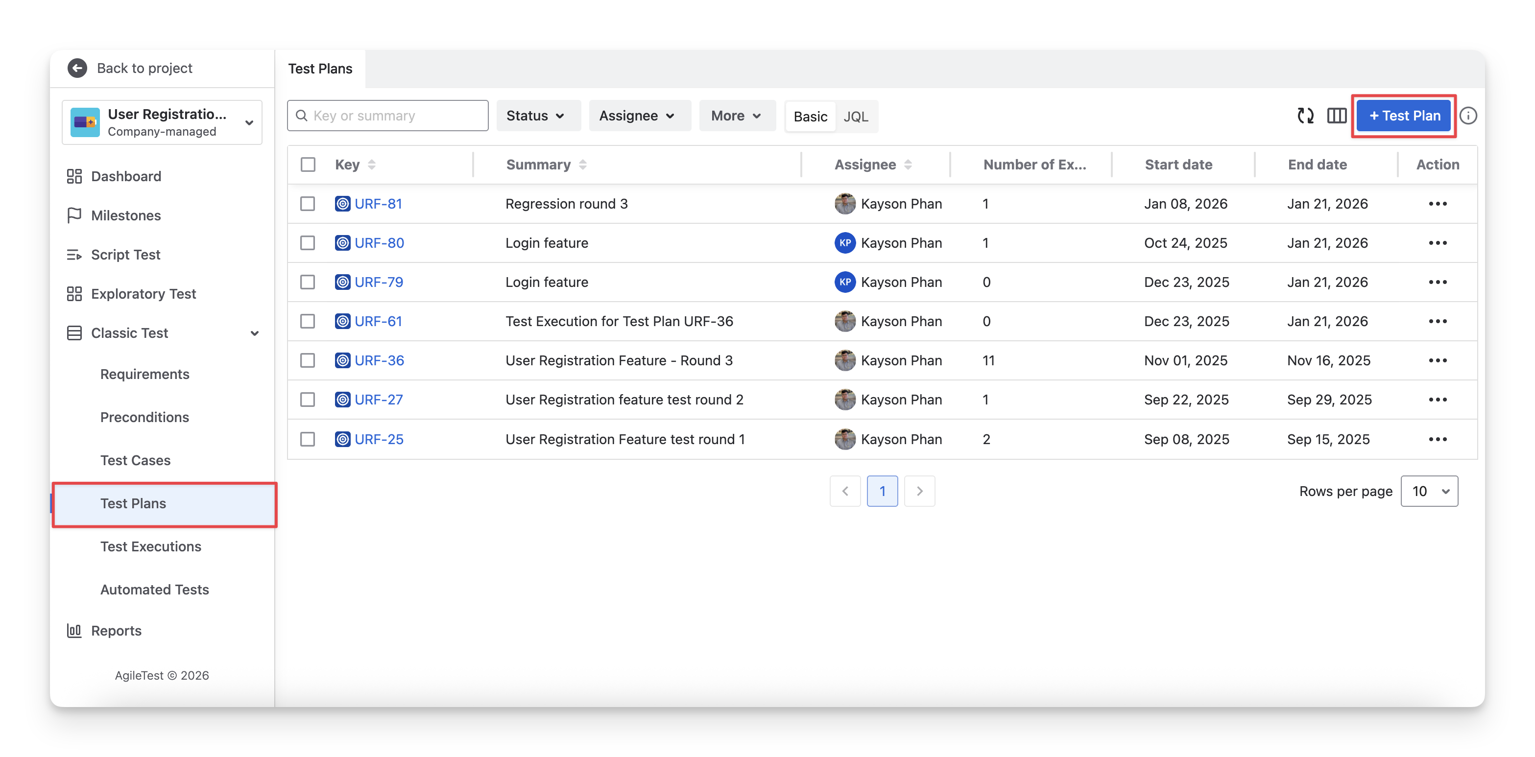 Navigate to the Classic Test section β Choose Test Plan. Here, you can click on the β+ Test Planβ button to create a new plan.