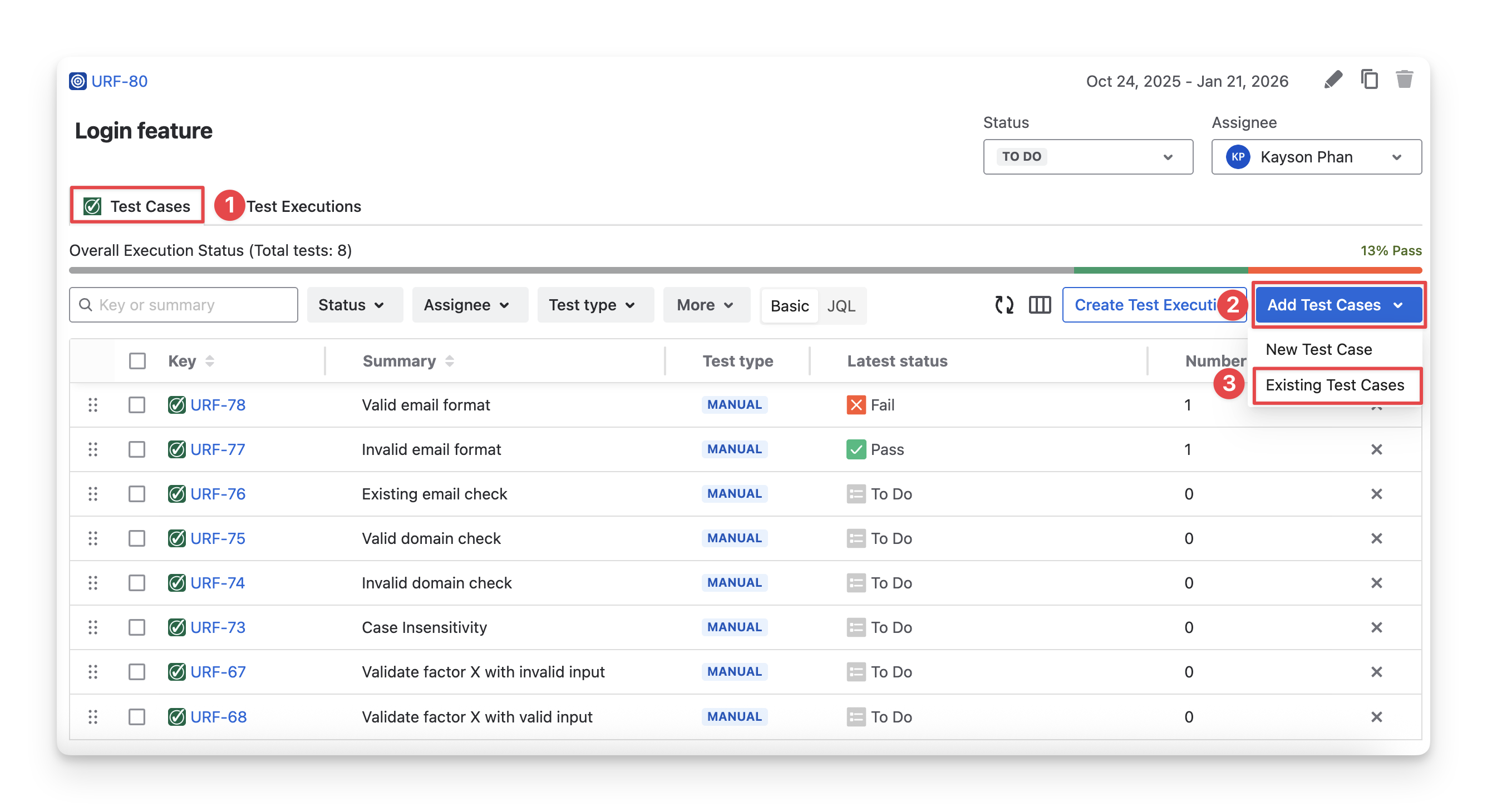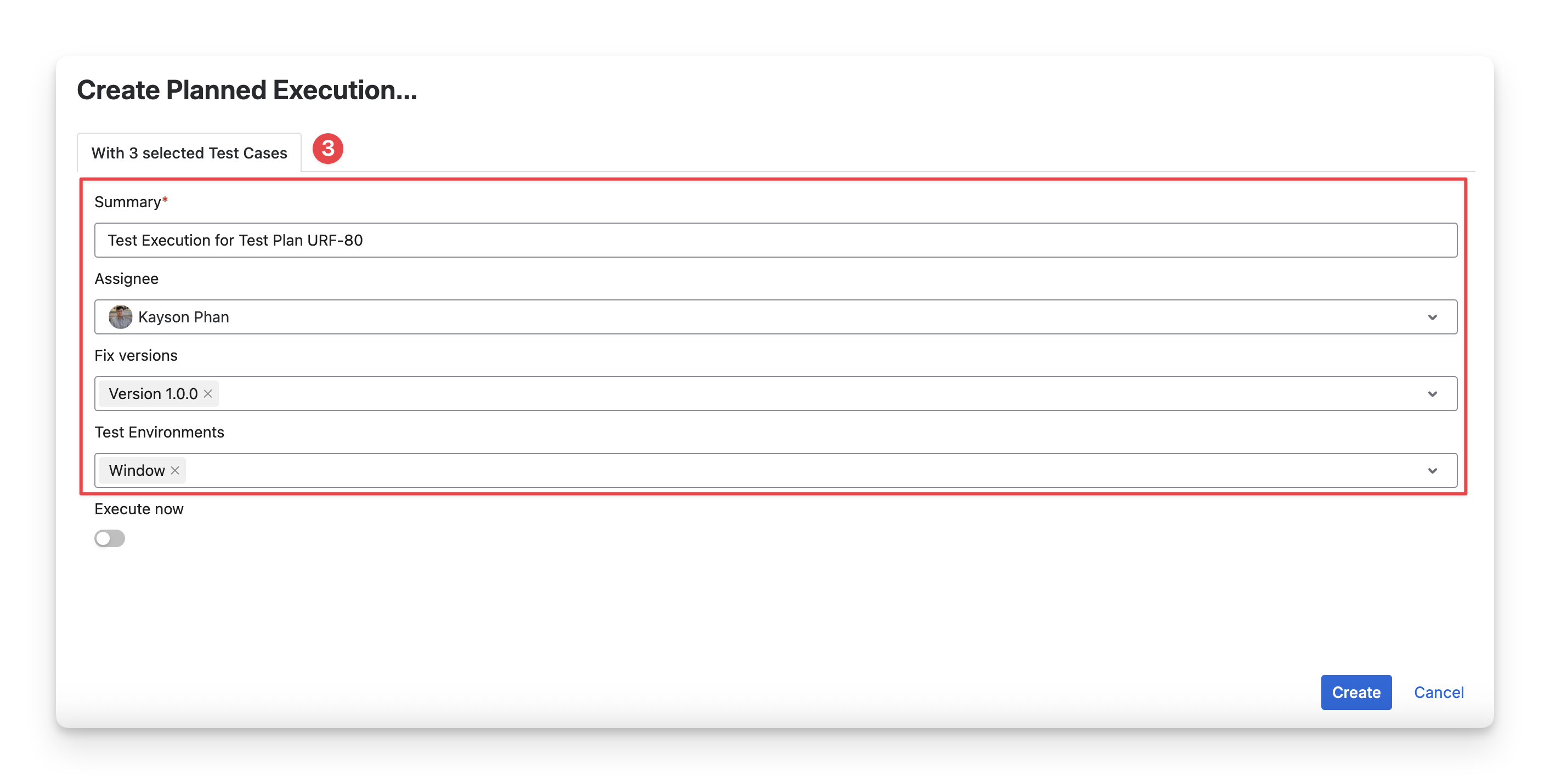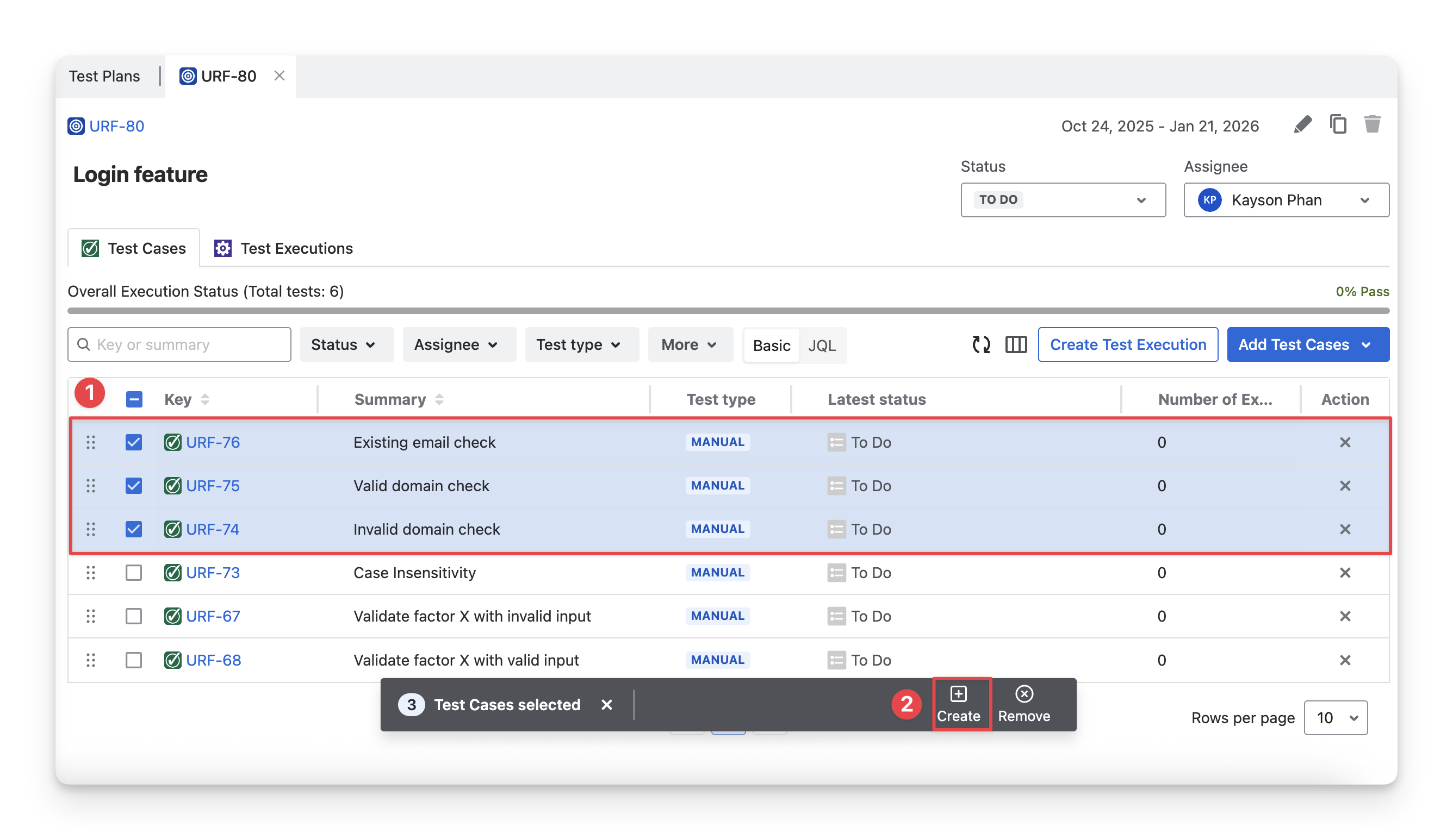 Once you have finished adding all the essential test cases, you can create test executions from these test cases to prepare for your test run. Here's how: