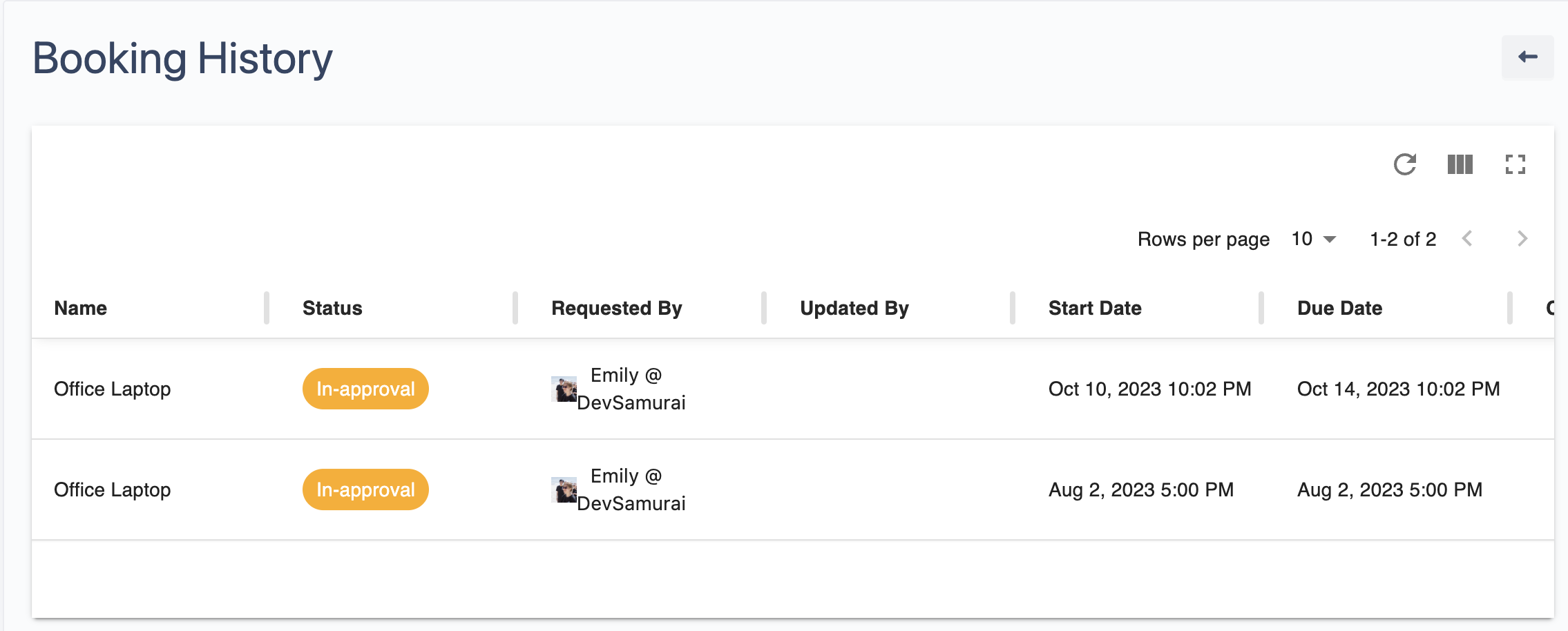 承認され、チェックアウトされたアイテムはすべて貸出ページに移動し、すべての却下アイテムは辞退セクションに移動します。