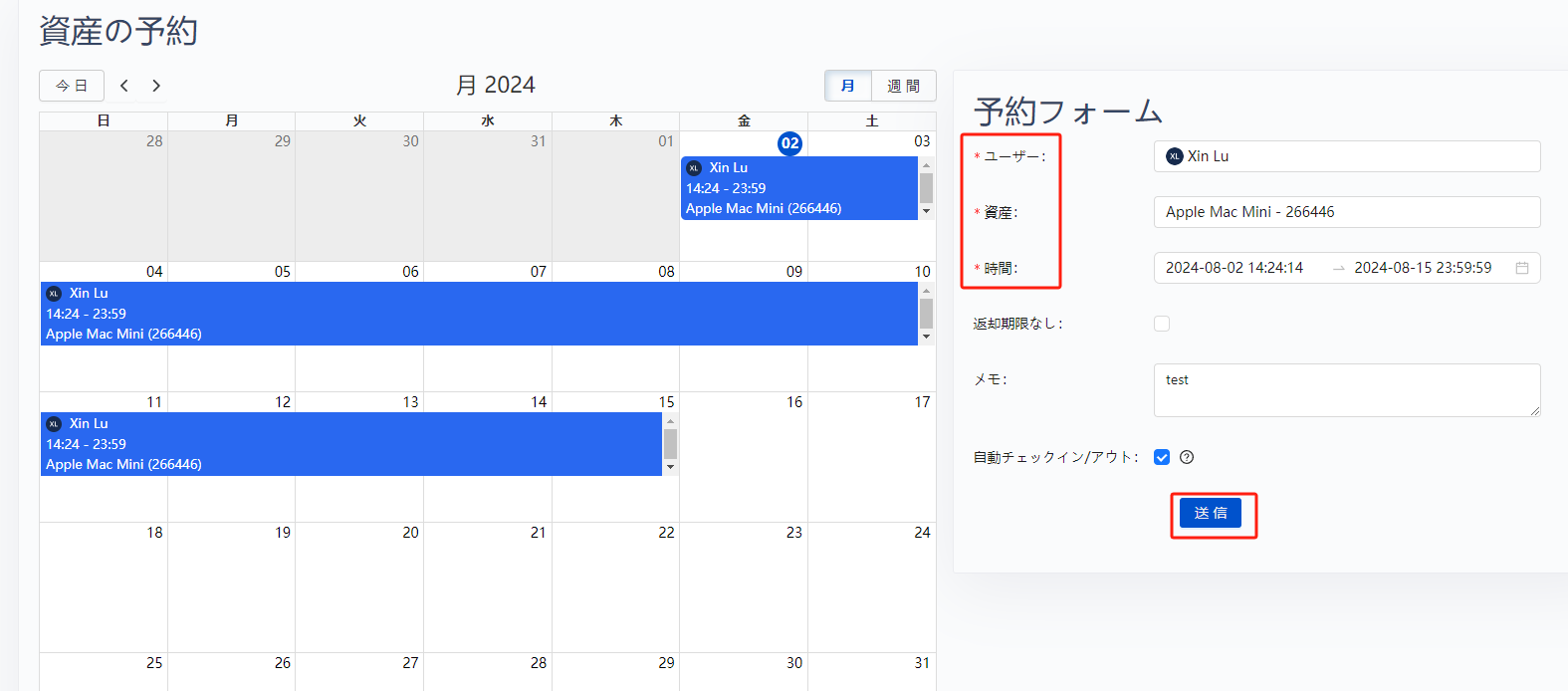 アプリ → AssetIT から資産予約ページに移動し、左サイドバーから資産予約を見つけてください。