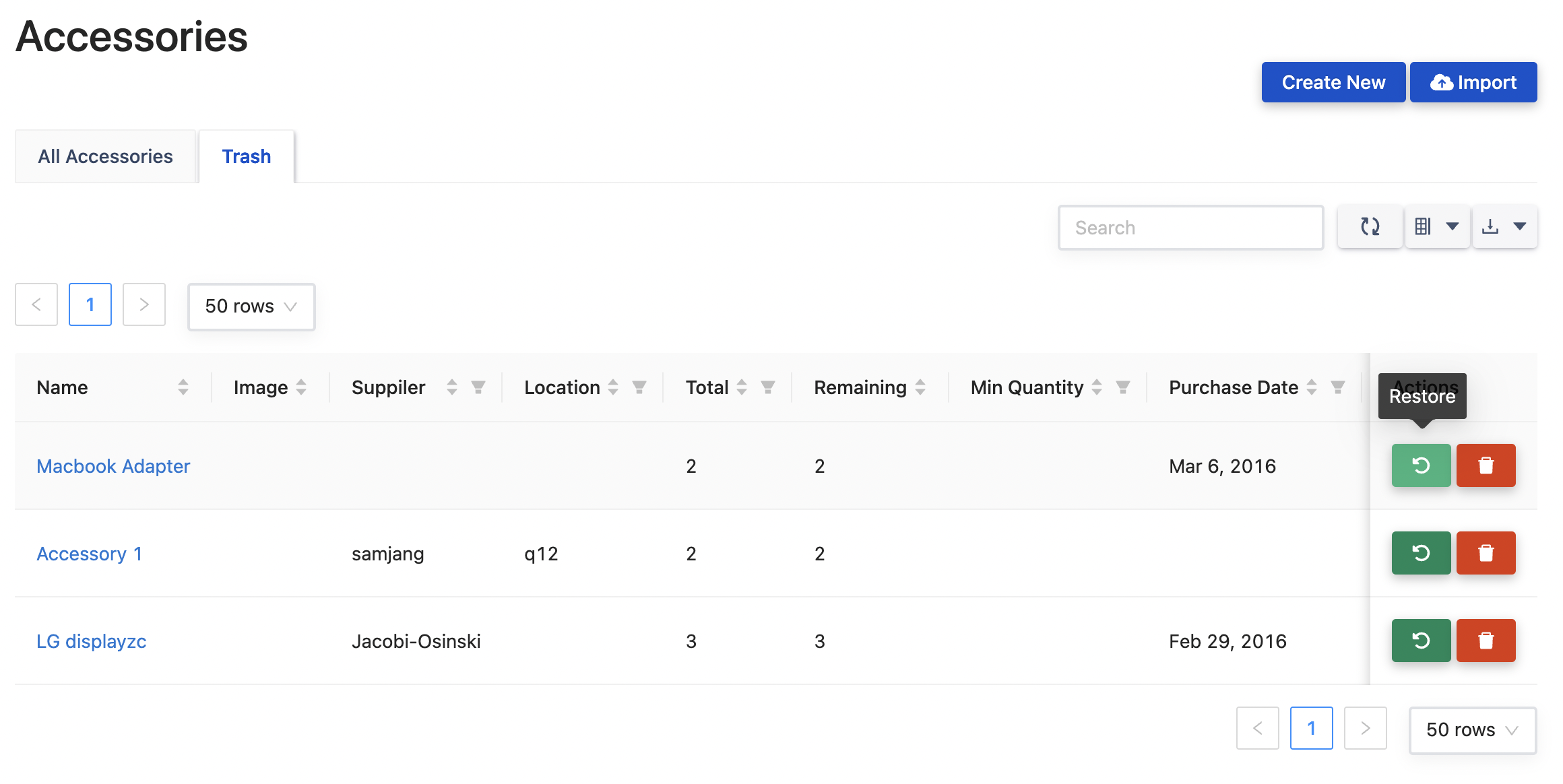 アクセサリー、ライセンス、消耗品、コンポーネントをゴミ箱に移動し、復元する能力