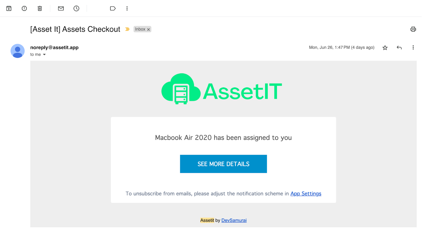 資産を割り当てた後、AssetITアプリの通知とは別に、チームメンバーに最新情報を提供するために、割り当て先に電子メール通知が送信されます。