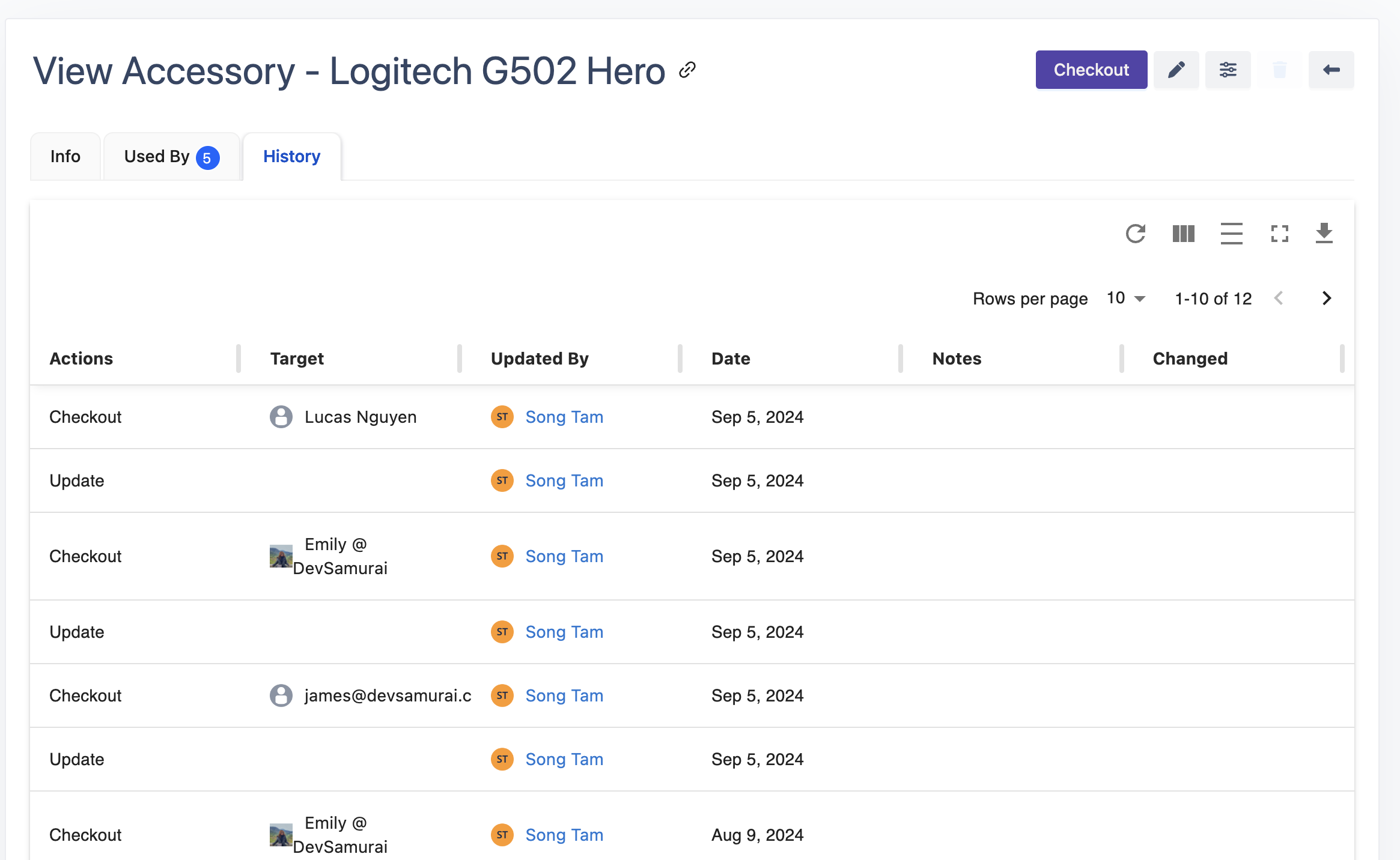 Used By: Provides a detailed overview of which users or assets have checked out the accessory.