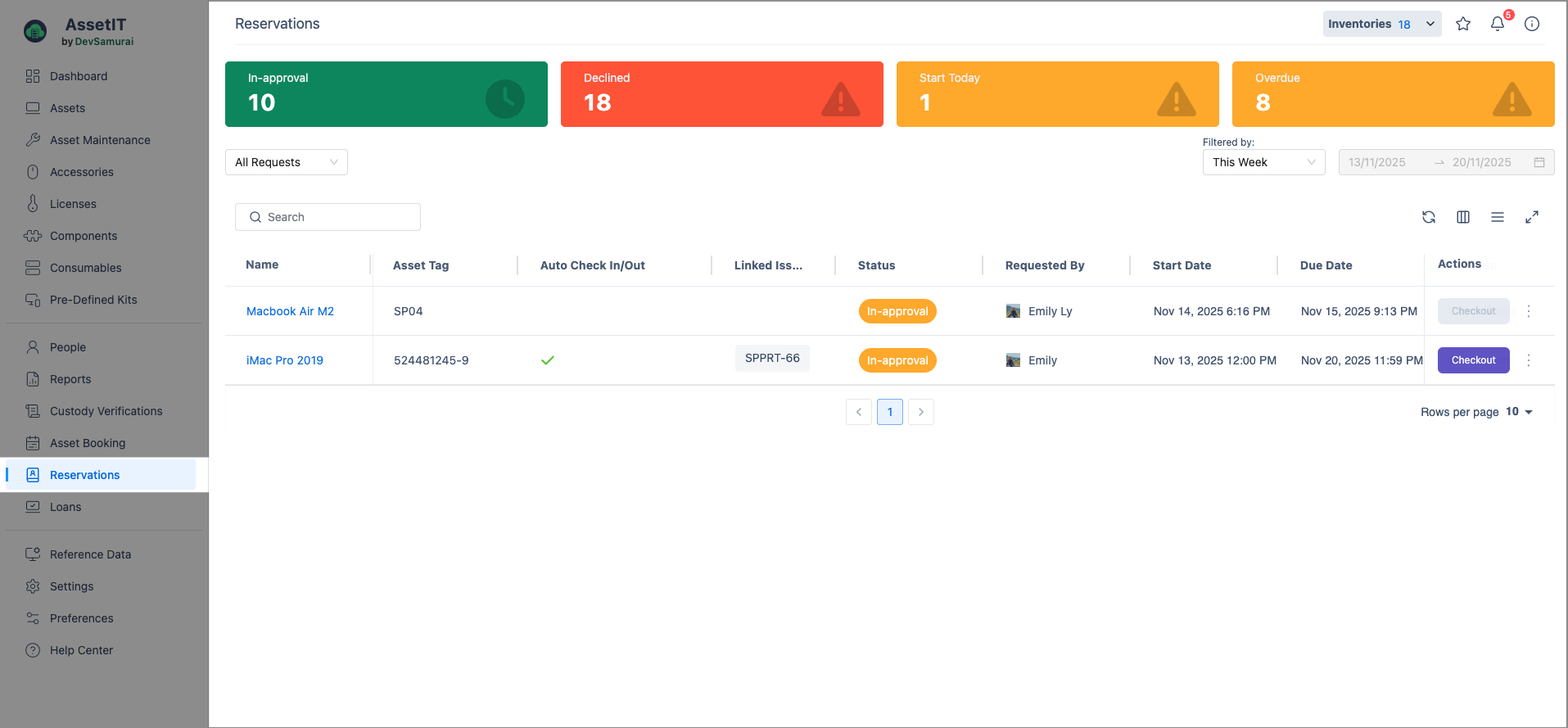 The Reservation feature in AssetIT allows you to manage asset booking requests. When a user submits a booking form, the request is automatically added to the Reservations section. Authorized users can review and approve or decline the requests and complete the checkout process.
