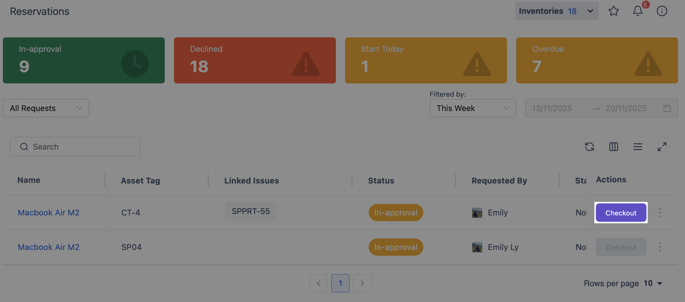 Overdue reservations are marked in red. These are requests that have passed their due date and need to be addressed as soon as possible. Make sure to take action on overdue reservations promptly to ensure proper asset management.