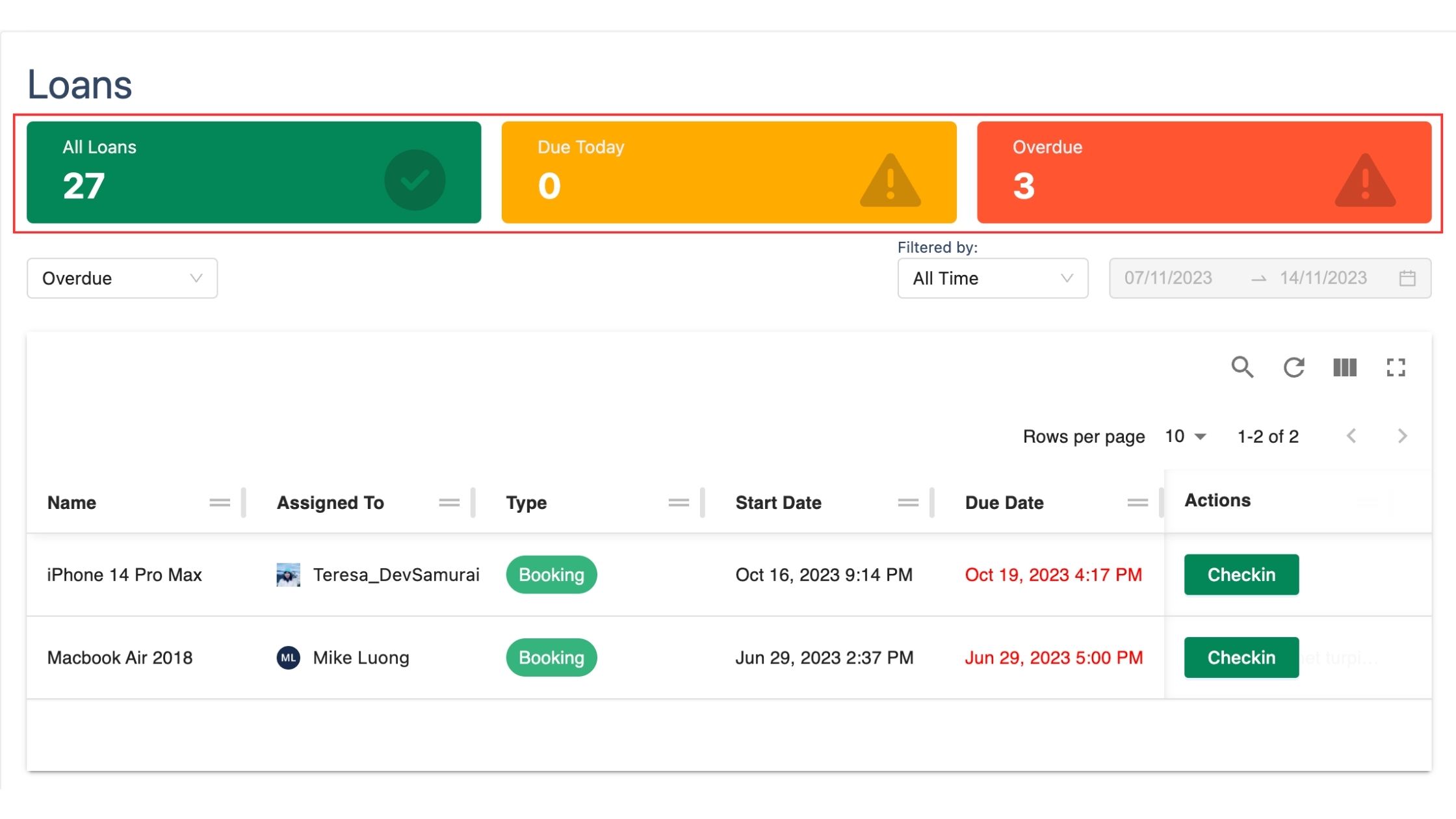 Within the loans table, you have the ability to easily navigate and browse checked out assets by accessing the All Loans, Due Today, and Overdue sections
