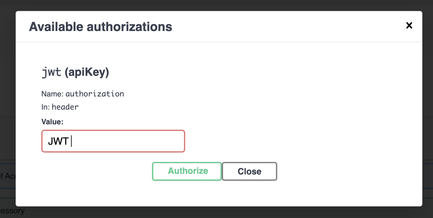 Step 7: It's crucial to prepend the token with "JWT " (including a space after JWT) to activate its functionality properly. Click Authorize to finish.