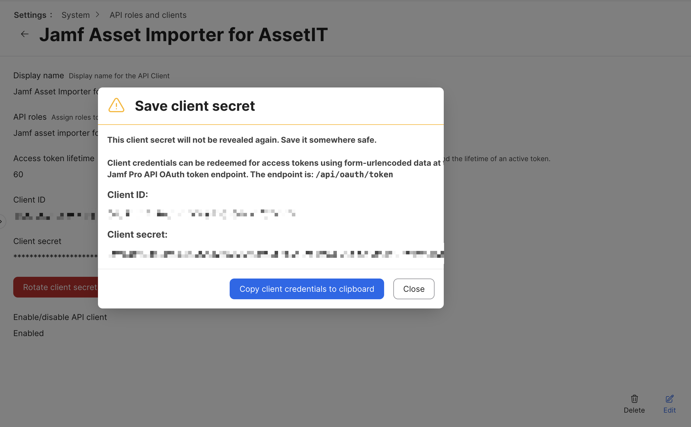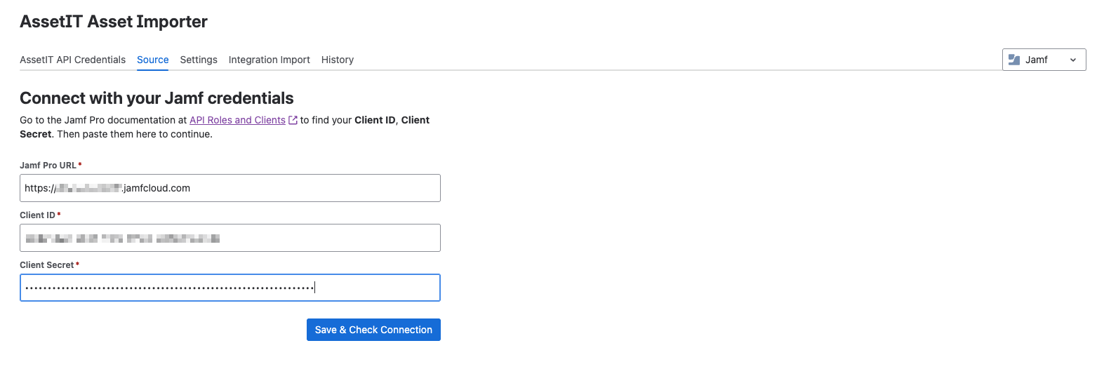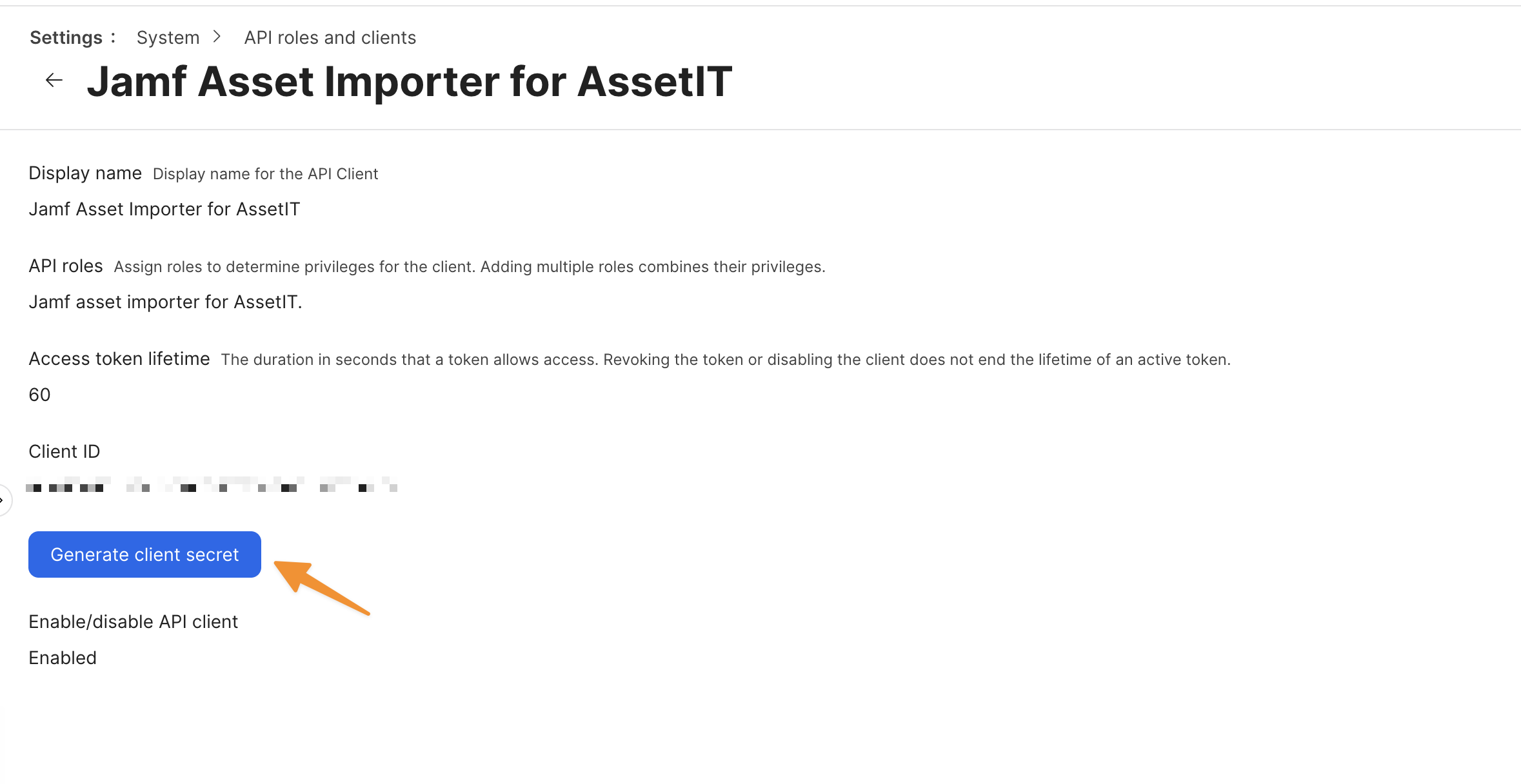 To integrate Jamf with AssetIT Asset Importer, you must first register a role and client in your Jamf Pro environment to obtain the Client ID and Client Secret. After generating these credentials, you can enter them into the AssetIT Asset Importer and complete the integration.