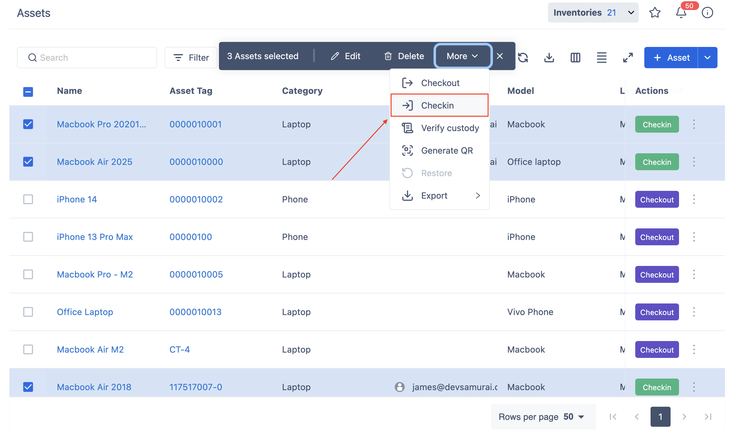 Bulk Checkin allows you to return multiple assigned assets at once. This ensures that assets are properly updated in the system and are available for future use.