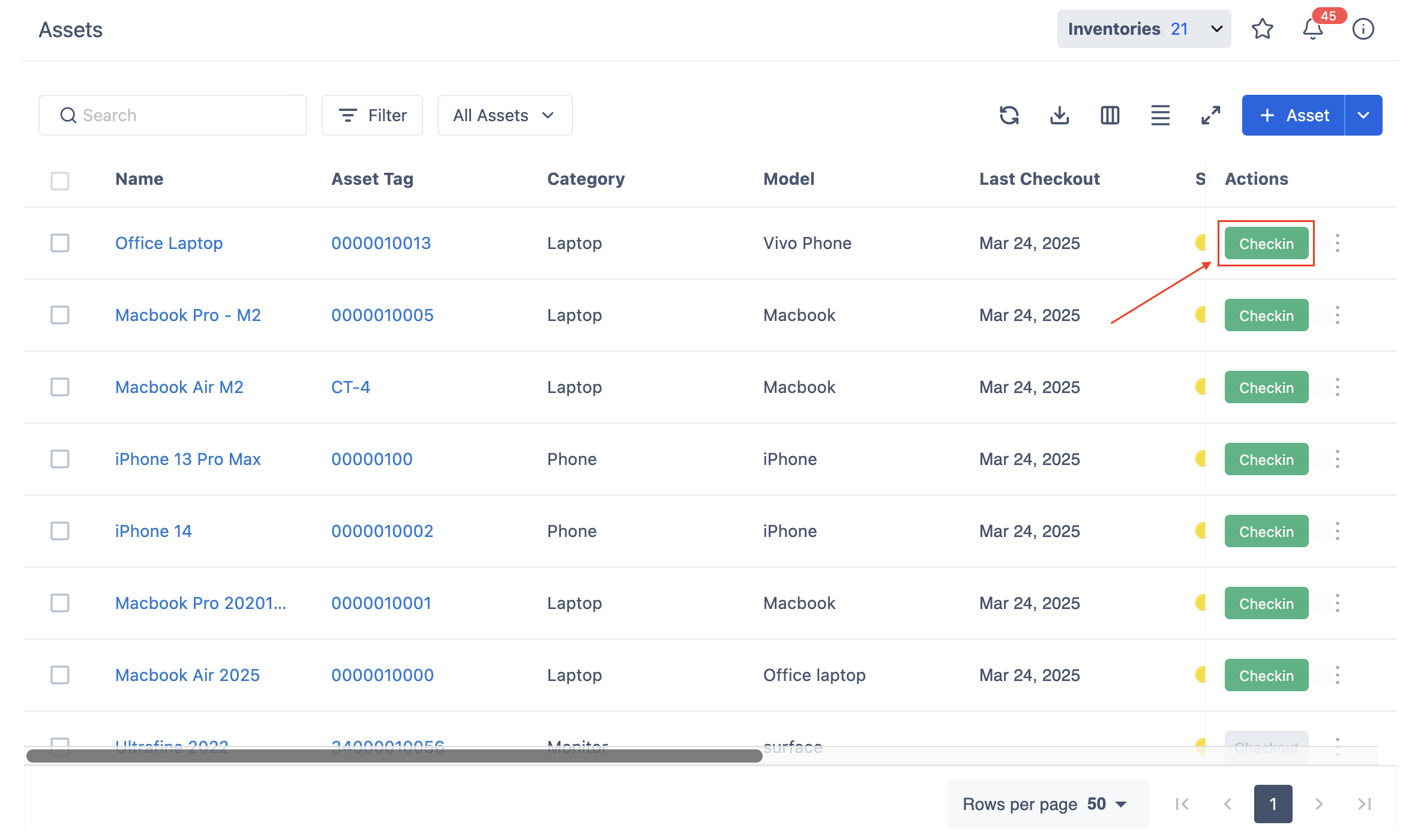 What is Checkin? Checkin is the process of returning an asset that has been previously checked out or assigned. When you check in an asset, you are essentially marking it as available for future use or assignment. This action updates the asset's status and records that it is no longer assigned to a user, another asset, or a location.