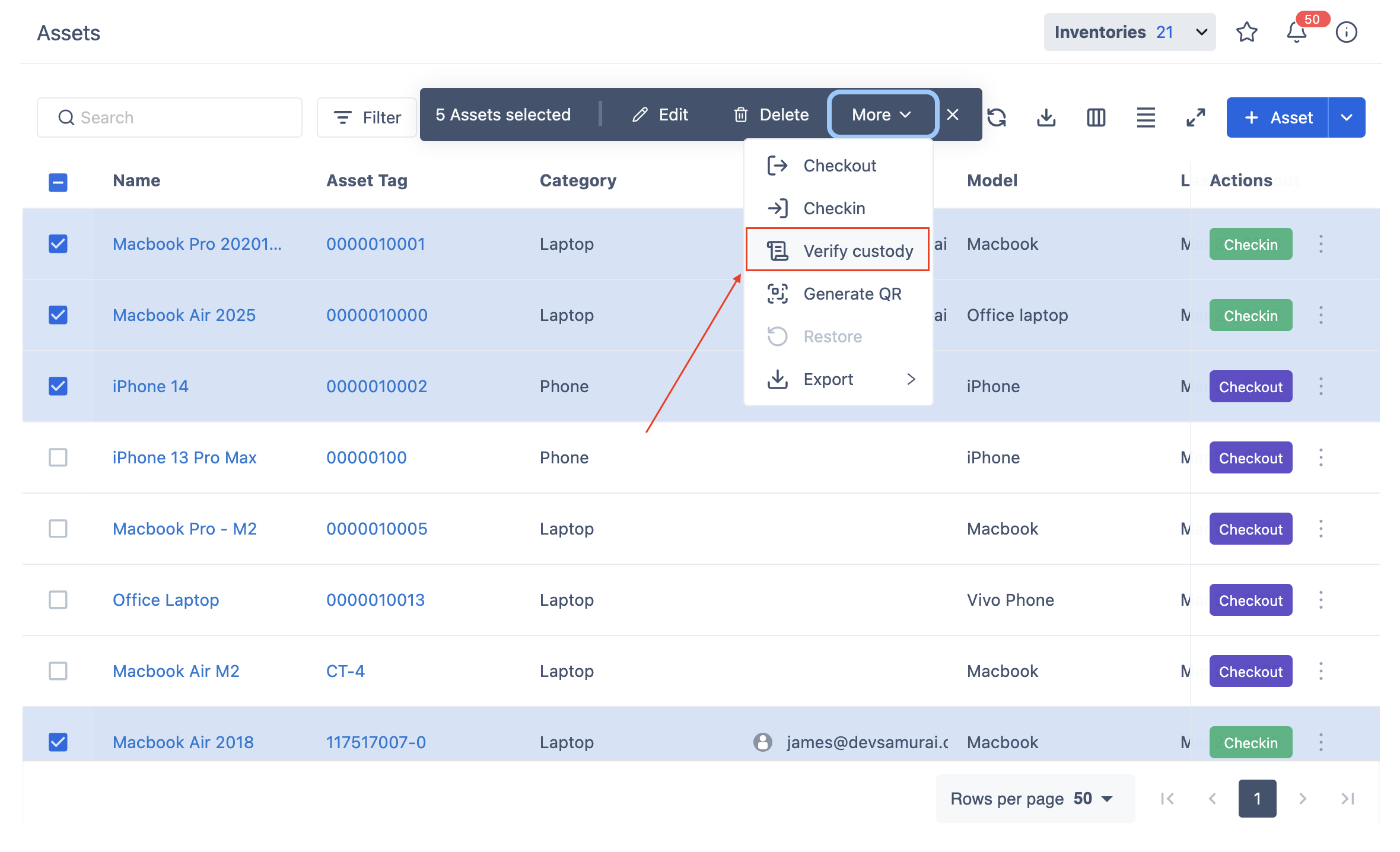 Bulk Custody Verification allows organizations to confirm asset assignments efficiently by sending verification requests to multiple users at once. This ensures accountability and helps maintain accurate asset records.