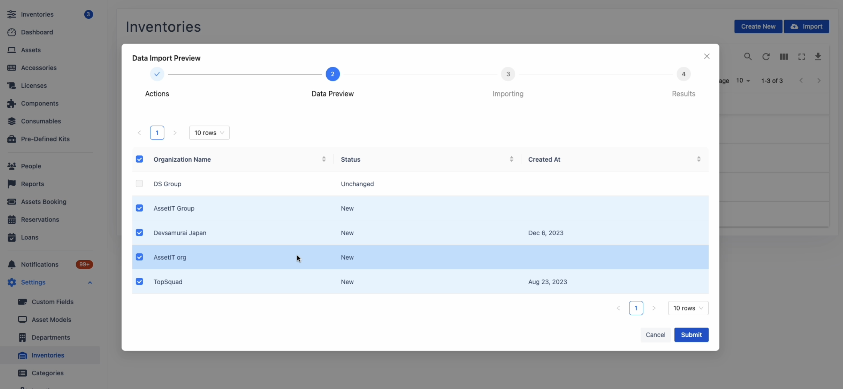 Choose organizations that you want to import to AssetIT as inventories. This selection enables AssetIT to pull data from your Jira Service Management account.