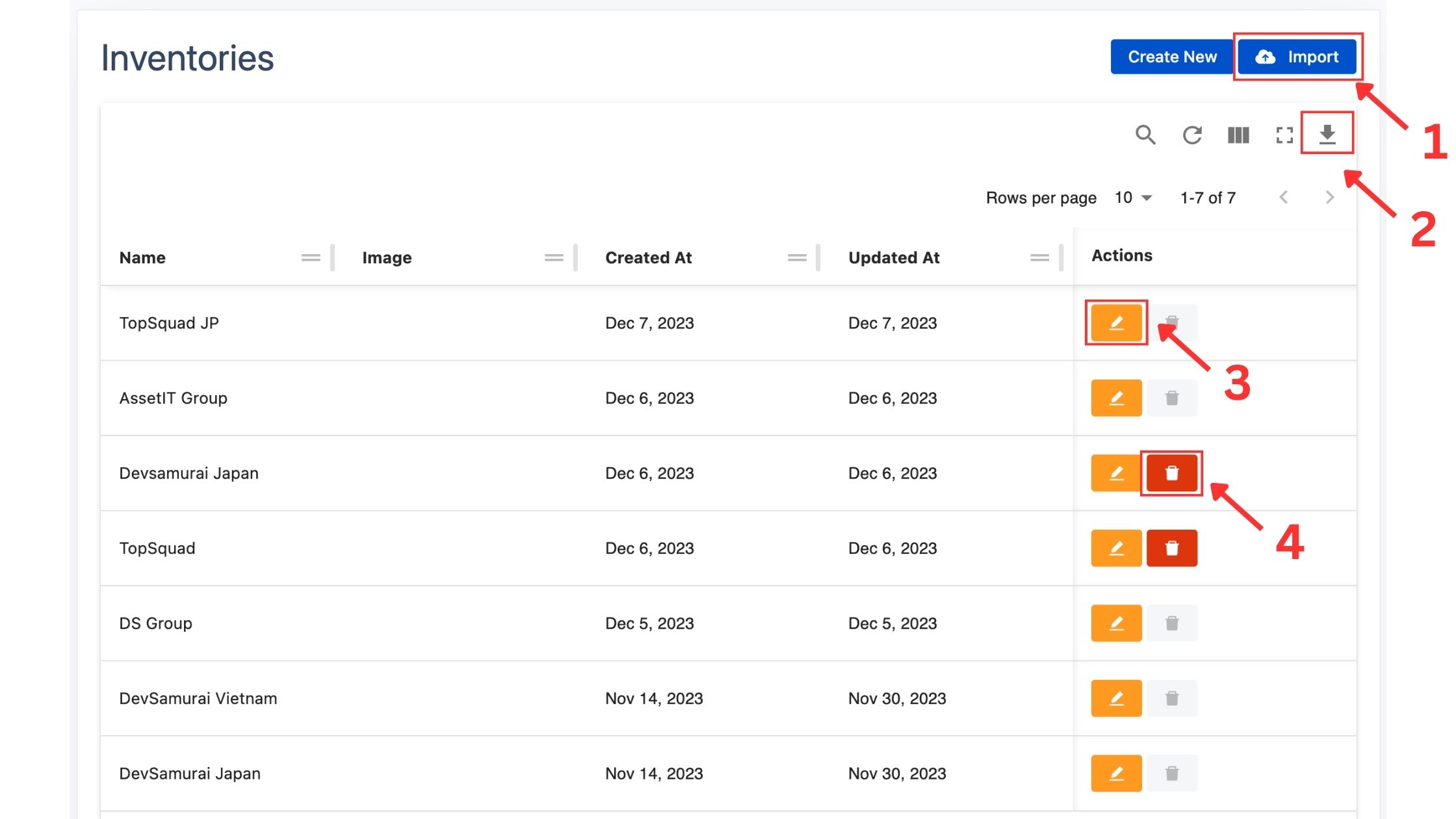 AssetIT provides flexible options for managing inventories, including importing (1), exporting (2), editing (3), and deleting (4) inventories. Before deleting an inventory, confirm that it does not contain any items.