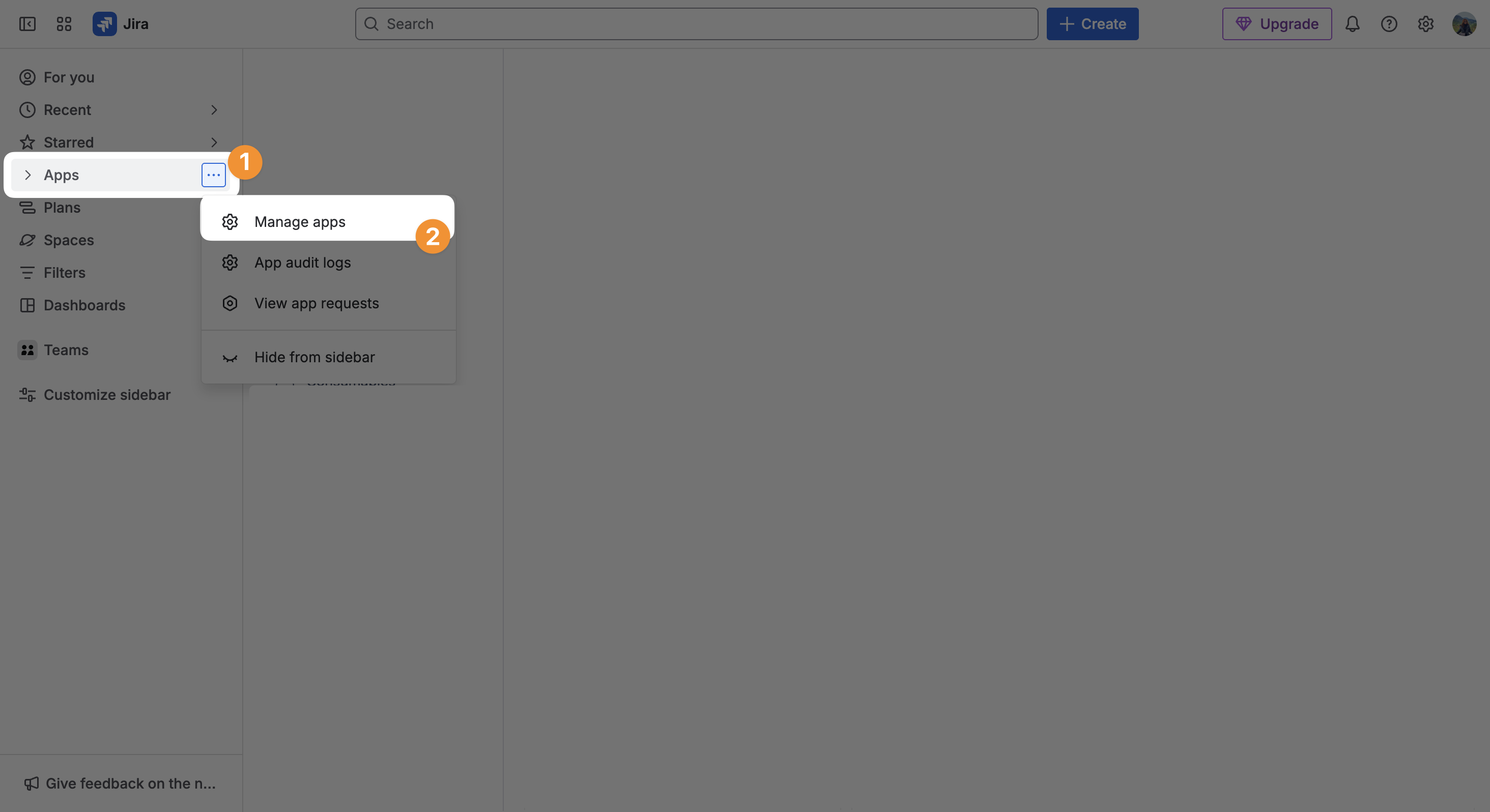 On the left-side bar of your Jira environment, find Apps > More actions (…), then click Manage apps.