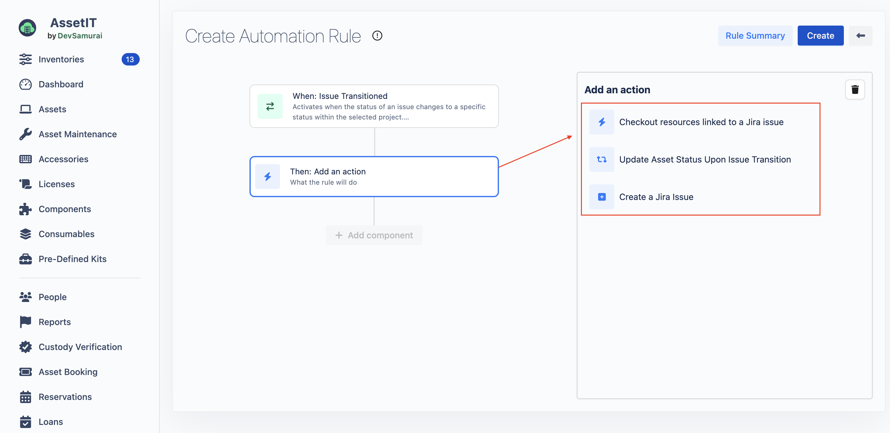 This action automatically updates the status of assets linked to the Jira issue.